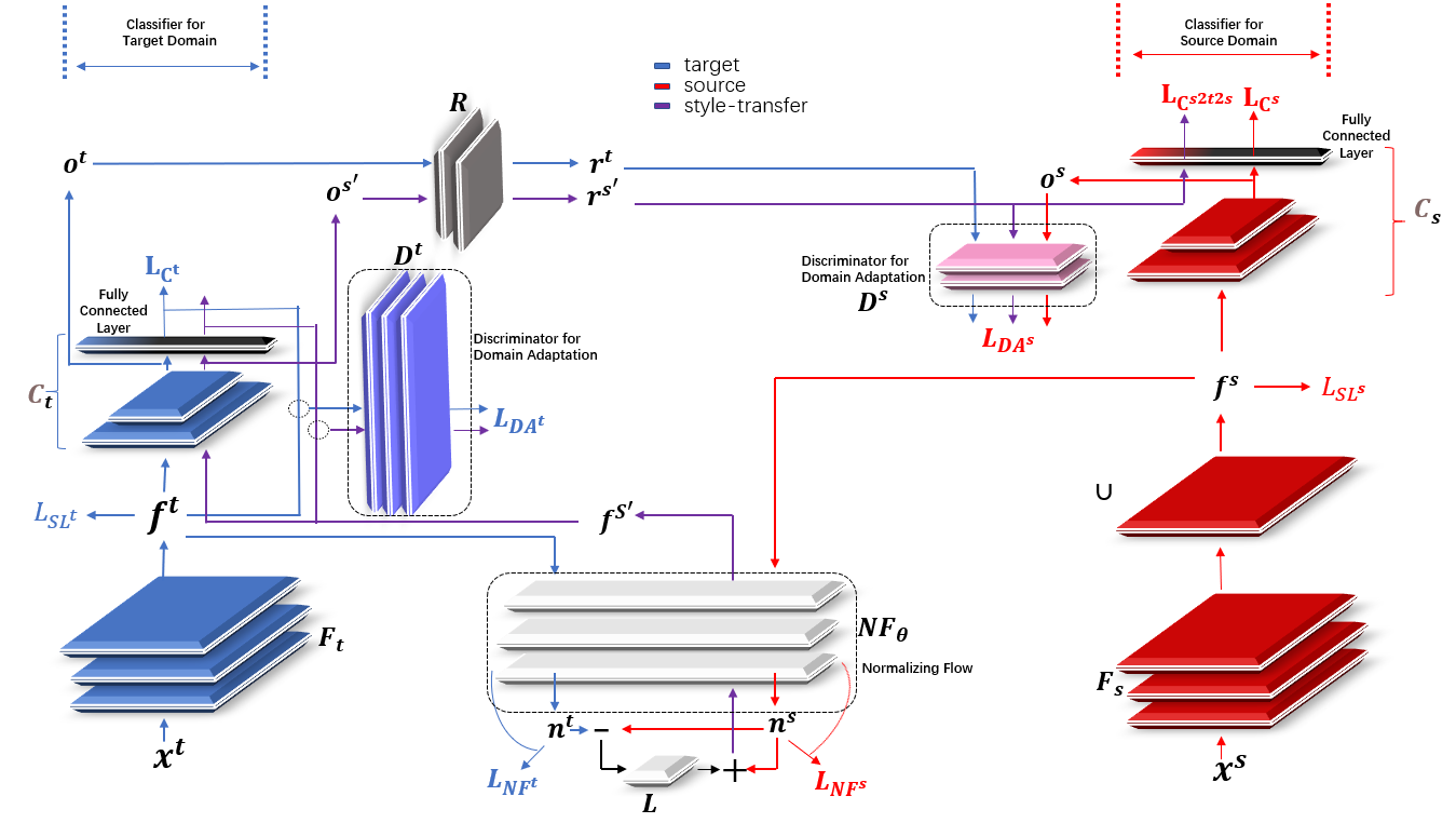 近日,清华大学深圳国际研究生院李星辉副教授团队受视觉任务中以CycleGAN为代表的风格迁移以及领域自适应中的条件对抗方法启发,构建了从弱相关时间序列分类数据集进行迁移学习的架构。该架构在考虑源域和目标域间的差异以及因此而可能产生的负迁移的基础上,将源域和目标域分类器分别搭建,通过在不同深度的表征层上进行对齐操作并借助归一化流生成同时带有目标域与源域特征的表征,实现了源域到目标域的迁移。由于在新表征的生成上以及计算的全流程上与风格迁移有相似之处,因而命名方法为特征层风格迁移。