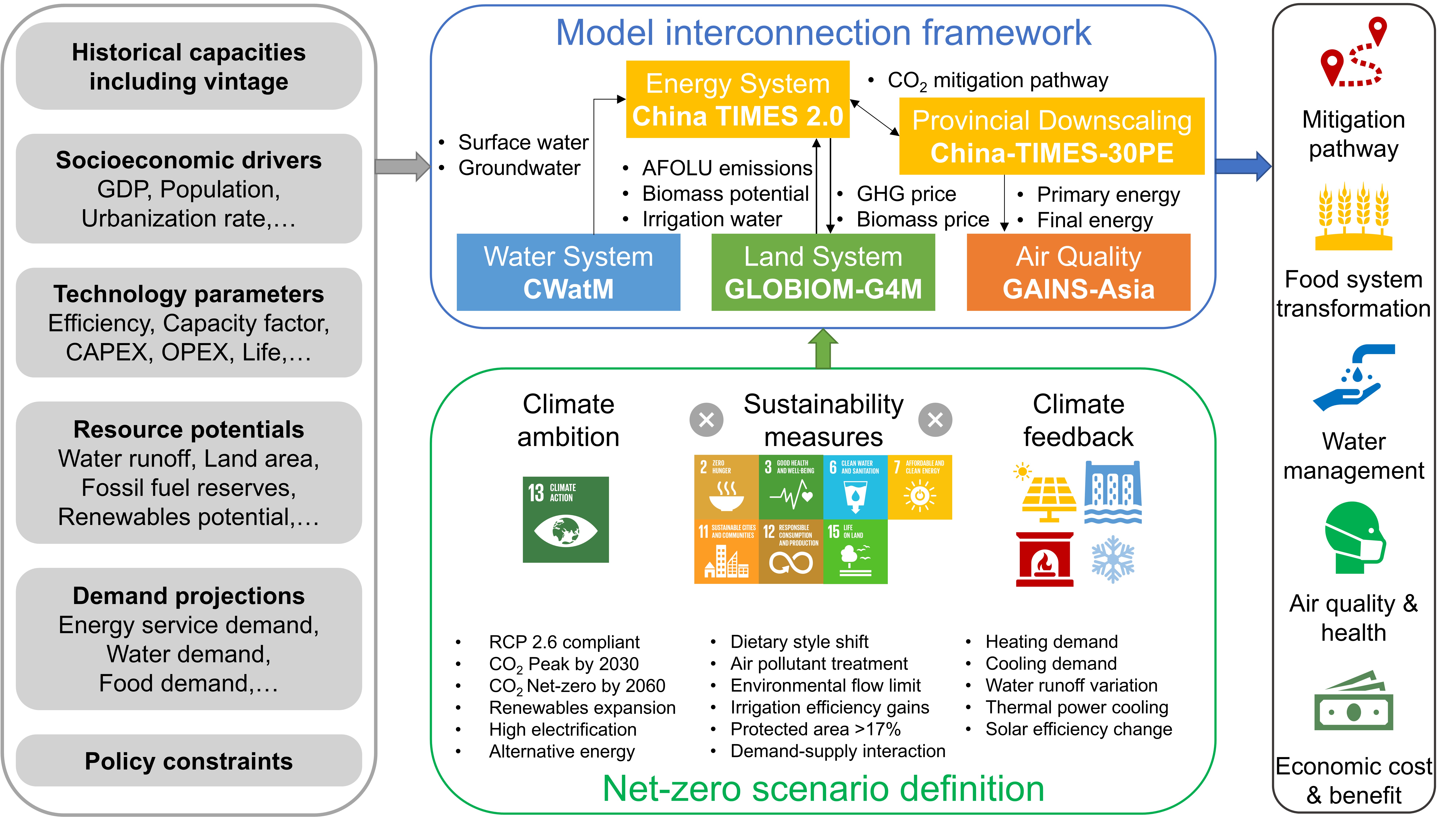 针对这一问题,清华大学核能与新能源技术研究院(以下简称“核研院”)陈文颖教授课题组和合作团队建立了一套多模型集成框架,实现了国家级能源模型China TIMES 2.0、省区级能源模型China-TIMES-30PE与土地利用模型GLOBIOM-G4M、水资源管理模型CWatM、空气质量模型GAINS-Asia的连接,综合考虑了气候和能源政策、可持续发展措施和气候反馈,探索和量化了中国在实现碳中和目标过程中,对环境相关可持续发展目标的协同效益和潜在权衡。研究成果为中国实现碳达峰碳中和的同时提高能源、土地、水、空气质量系统的可持续性提供了长期转型路径,为中国形成多系统协同的可持续发展方案提供支撑。