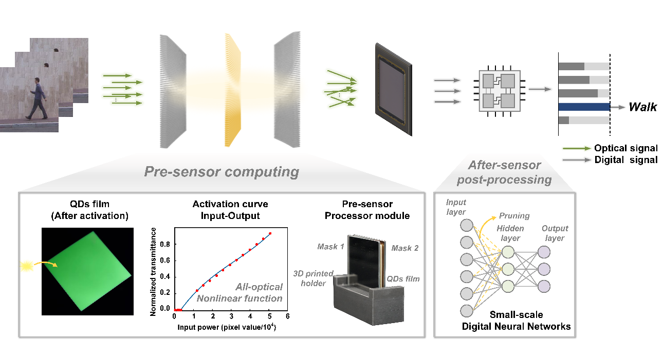 清华新闻网7月30日电 在物联网时代,视觉图像传感器作为智能社会的关键设备,被嵌入到诸如移动通信终端、智能穿戴设备、汽车和工业机器等各种设备中。随着应用的不断扩展,对传感器的系统功耗、响应速度、安全性能等方面也提出了更高的要求。而在传统的“感传算”链路中,内存的访问速度和通信带宽逐渐成为了限制系统功耗及速度的主要瓶颈。将计算单元向传感单元靠近,使系统的近传感端拥有一定的数据处理能力,逐渐成为解决这一问题的有力途径。感前光计算相比于其他近感计算方式,具有高速、高带宽、低功耗的优势。然而,目前绝大部分光神经网络需要相干激光作为光源,硬件系统笨重复杂,且仅能完成线性运算,缺乏层间非线性激活,限制了感前光计算在边缘场景的应用。