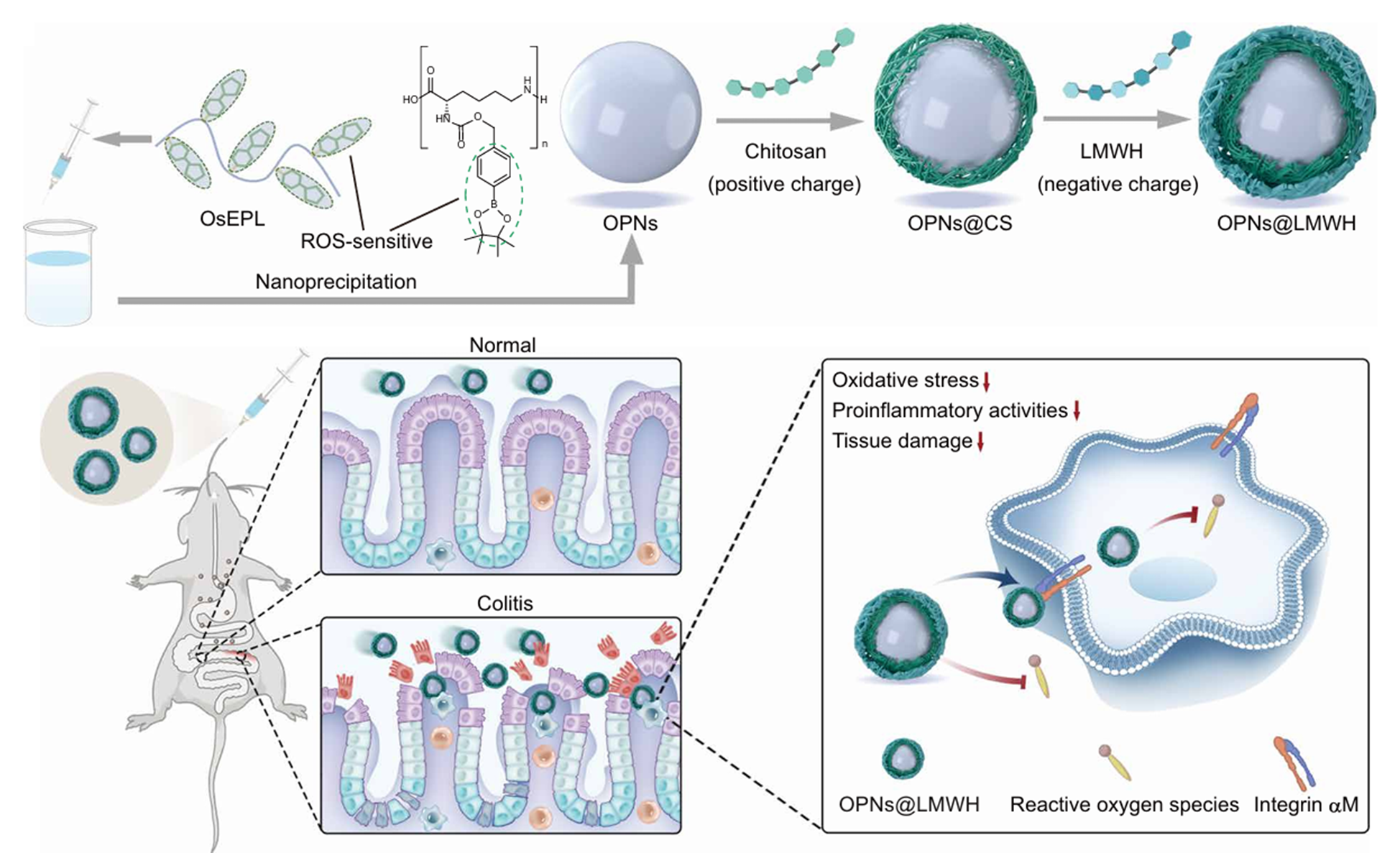 研究团队针对炎症细胞在UC病变部位的运输和浸润现象,提出了一种基于整合素αM靶向和活性氧(Reactive oxygen species, ROS)清除的设计思路。团队首先合成了一种基于苯硼酸酯和ε-聚赖氨酸偶联形成的氧化敏感型高分子材料OsEPL,并将OsEPL通过纳米沉淀法制备成纳米粒子OPNs。该设计有效保证了产物OsEPL的结构明确性以及ROS清除活性。随后团队采用逐层自组装技术将低分子量肝素(Low molecular weight heparin, LMWH)结合至OPNs表面形成核壳结构纳米粒子OPNs@LMWH,借助肝素-整合素αM相互作用机制实现了对炎性细胞迁移和浸润的靶向(图1)。