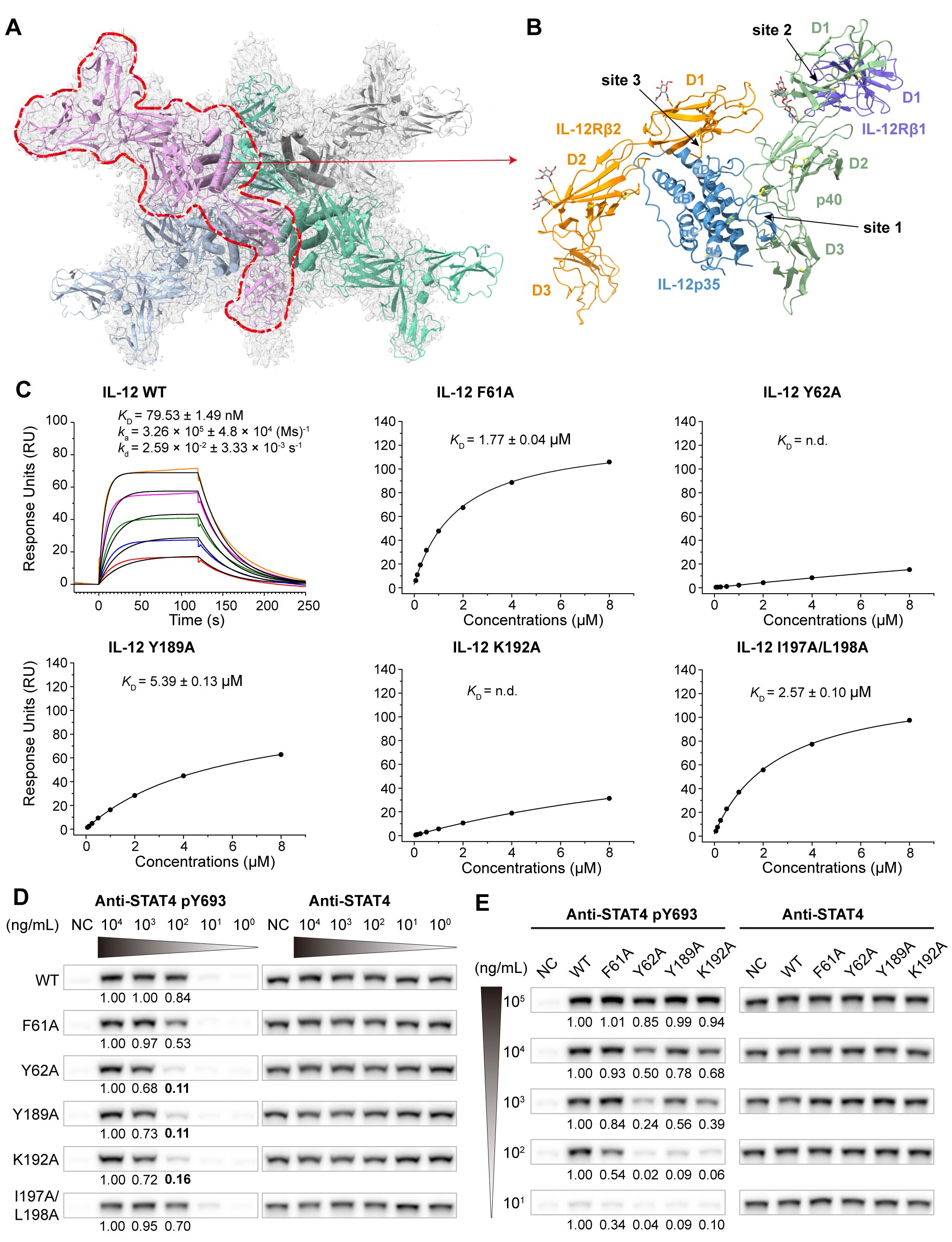 图2.(A-B)人源IL-12结合受体IL-12Rβ1和IL-12Rβ2的冷冻电镜结构;(C)IL-12突变体与IL-12Rβ2的亲和力检测;(D-E)IL-12突变体介导细胞STAT4磷酸化水平检测