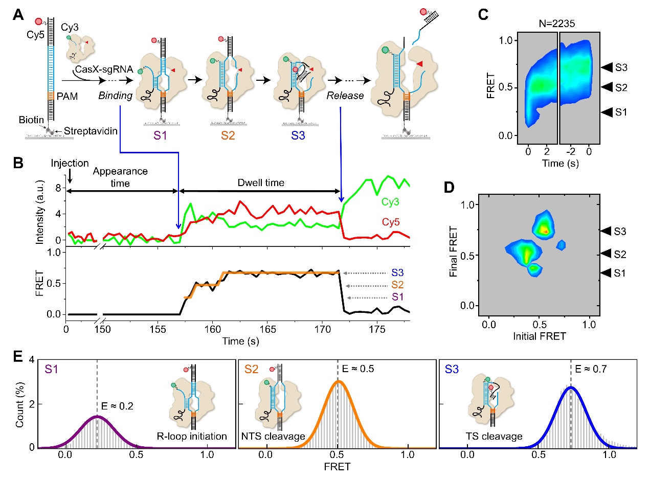 近日,清华大学生命科学学院陈春来课题组与刘俊杰课题组合作在《核酸研究》(Nucleic Acids Research)杂志发表了题目为“单分子FRET揭示CasX(Cas12e)在DNA切割过程中的构象动态”(Conformational dynamics ofCasX(Cas12e) in mediating DNA cleavage revealed by single-molecule FRET)的研究论文。该论文细致表征了CasX从非特异性结合到找到靶点并完成切割的动态过程,揭示了其独特的机制。