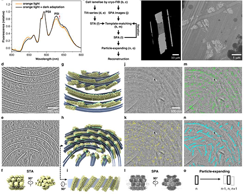 清华新闻网8月26日电 藻胆体(phycobilisome, PBS)是蓝藻和红藻主要的捕光天线,通过共价连接的色素团(bilins)将捕获的光能以极高的效率传递至光系统II(photosystem II, PSII)和光系统I(photosystem I, PSI)的反应中心以诱导光-化学能量的转化。虽然大多数光合作用相关蛋白复合物的结构已通过体外纯化的方式得到了解析,但在细胞内的天然状态下它们之间相互作用的方式以及能量传递的途径尚未得到解释。