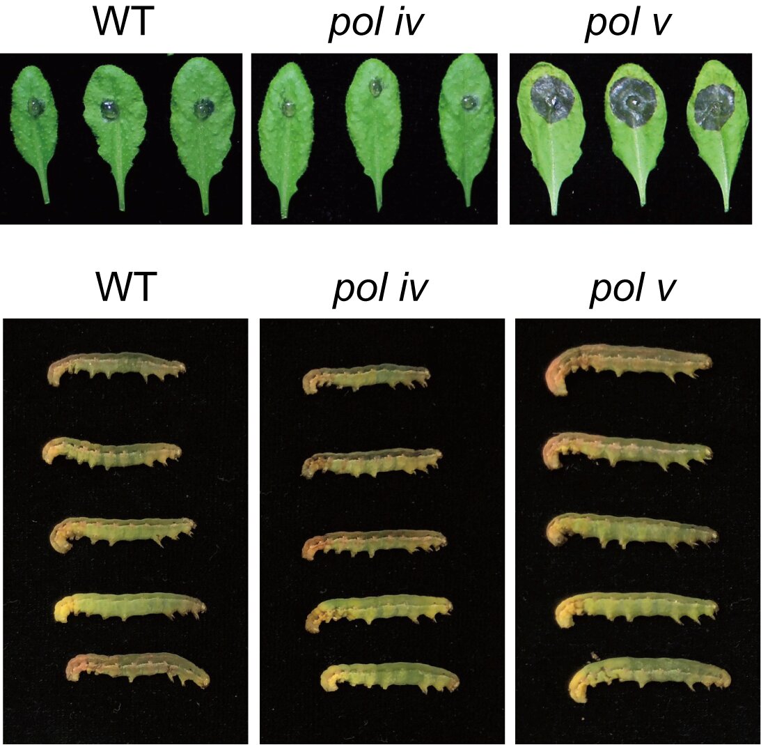 清华新闻网8月28日电 真核生物有三种非常保守的RNA聚合酶,Pol I、Pol II和Pol III,它们分别产生rRNA、mRNA和tRNA等不同种类的RNA。而在植物中,还存在两种额外的RNA聚合酶,Pol IV和Pol V。Pol IV和Pol V转录本在RNA介导的DNA甲基化(RdDM)通路中发挥关键作用。其中,Pol IV转录本可被加工成24-nt siRNA,siRNA与AGO4蛋白结合,并通过与Pol V转录本互补配对,将AGO4复合物招募至靶标位点,介导DNA从头甲基化。清华大学生命学院戚益军课题组前期发现,与野生型相比,昆虫更喜欢取食pol v突变体叶片,而对pol iv突变体并无明显偏好。他们由此推测,Pol V在植物抗虫过程中有异于Pol IV或RdDM的独特功能。经深入研究,最终揭示Pol V转录本以独立于RdDM通路的方式,促进邻近基因的转录,从而正向调控植物对灰霉和甜菜夜蛾的抗性。