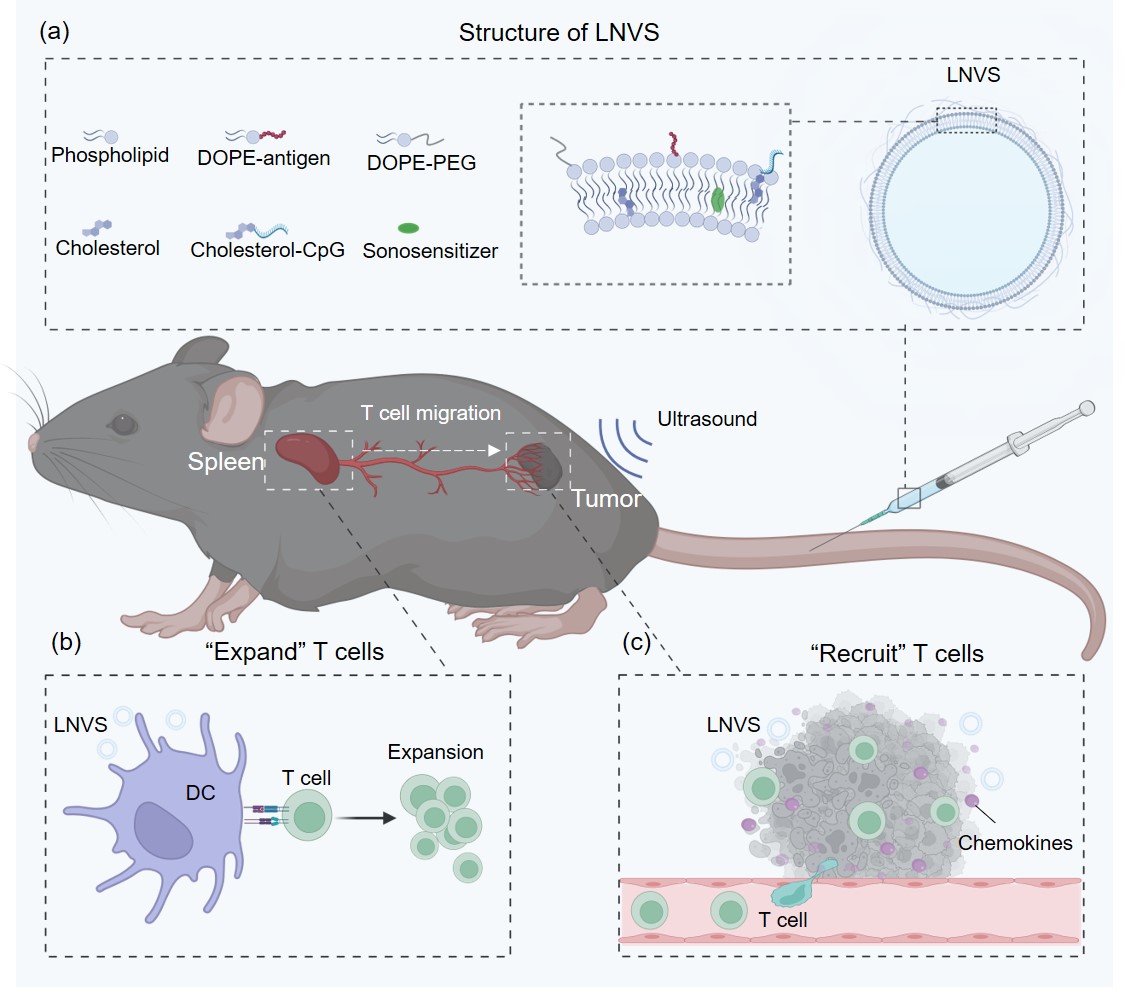 该研究报道了一种利用超声波响应性的脂质纳米疫苗LNVS控制T细胞的扩增和在肿瘤组织的募集的方法。静脉注射的LNVS以一种高度依赖脂质流动性和表面蛋白冠组成的方式在脾脏蓄积并扩增抗原特异性的T细胞。此外,部分LNVS可以被动蓄积在肿瘤组织,并响应超声波产生活性氧进而增加肿瘤组织中趋化因子和黏附分子的表达,最终促进抗原特异性T细胞向肿瘤组织的募集并产生强大的抗肿瘤效果。