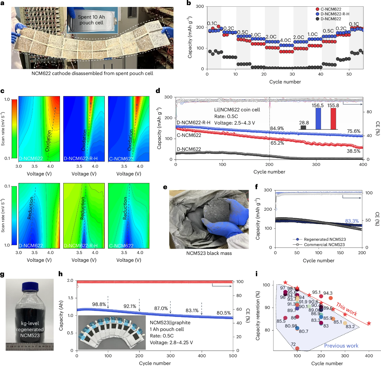 该方法在实验室拆解的电池材料以及实际电池厂拆解的正极废料上均得到了有效性验证,所得公斤级修复材料的容量与循环性能在已有报道的修复材料中处于最佳水平,并与同类全新商业材料的性能水平相当。