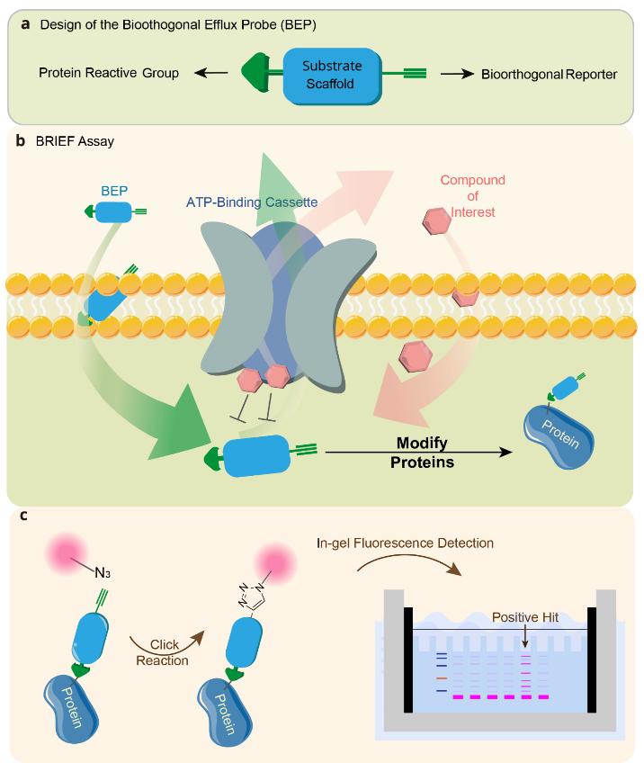 在BRIEF实验中,如果待检测药物和BEP通过了相同外排泵,会产生竞争效应导致BEP外排减少,从而增加BEP的胞内浓度及其蛋白质标记强度(图1b)。通过对细胞裂解物进行点击化学反应偶联荧光基团,可通过胶内荧光检测判断细胞内BEP水平(图1c)。基于此,BRIEF技术将瞬时动态的外排过程记录为稳定、可累积的化学标记信号,便于后续检测。