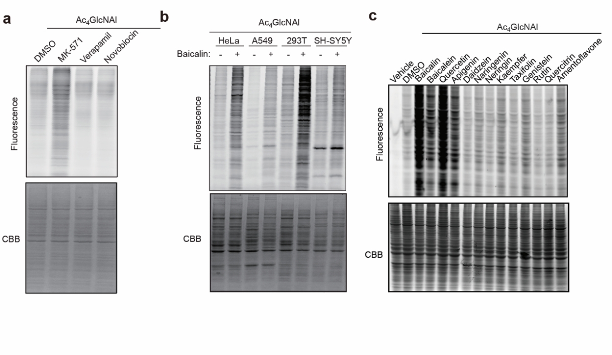 为了验证BRIEF的可行性,首先需要发展特异的BEP探针。研究人员首先关注到了全乙酰化非天然糖探针(如Ac4GlcNAl),这类探针被广泛应用于糖质代谢标记研究糖基化的生物学功能。乙酰化保护显著提高了非天然糖探针的疏水性和细胞膜通透性,但近年来也发现乙酰化保护造成了非天然糖探针与半胱氨酸的副反应。由于此类疏水探针可能是外排泵的潜在底物,同时又具有特异的胞内蛋白反应活性,研究人员首先探究了全乙酰化非天然糖探针成为BEP的潜力。以Ac4GlcNAl探针为例,研究人员利用不同泵的抑制剂共同处理细胞,发现ABCC家族的抑制剂MK-571显著提高了Ac4GlcNAl的标记信号(图2a)。这表明Ac4GlcNAl主要通过ABCC亚家族排出,因此研究人员分别敲低了ABCC的不同外排泵,发现了负责其外排的外排泵为ABCC3,4,10和12,因此Ac4GlcNAl可以作为这些外排泵的BEP探针。研究人员随后选择了此类外排泵的已知底物黄芩苷来测试其对Ac4GlcNAl的外排竞争效果。结果显示在不同的细胞系中,黄芩苷处理都会增加Ac4GlcNAl的标记强度(图2b)。研究人员随后筛选了其他黄酮类化合物,发现槲皮素、芹菜素和黄芩素也都是潜在的ABCC底物(图2c)。