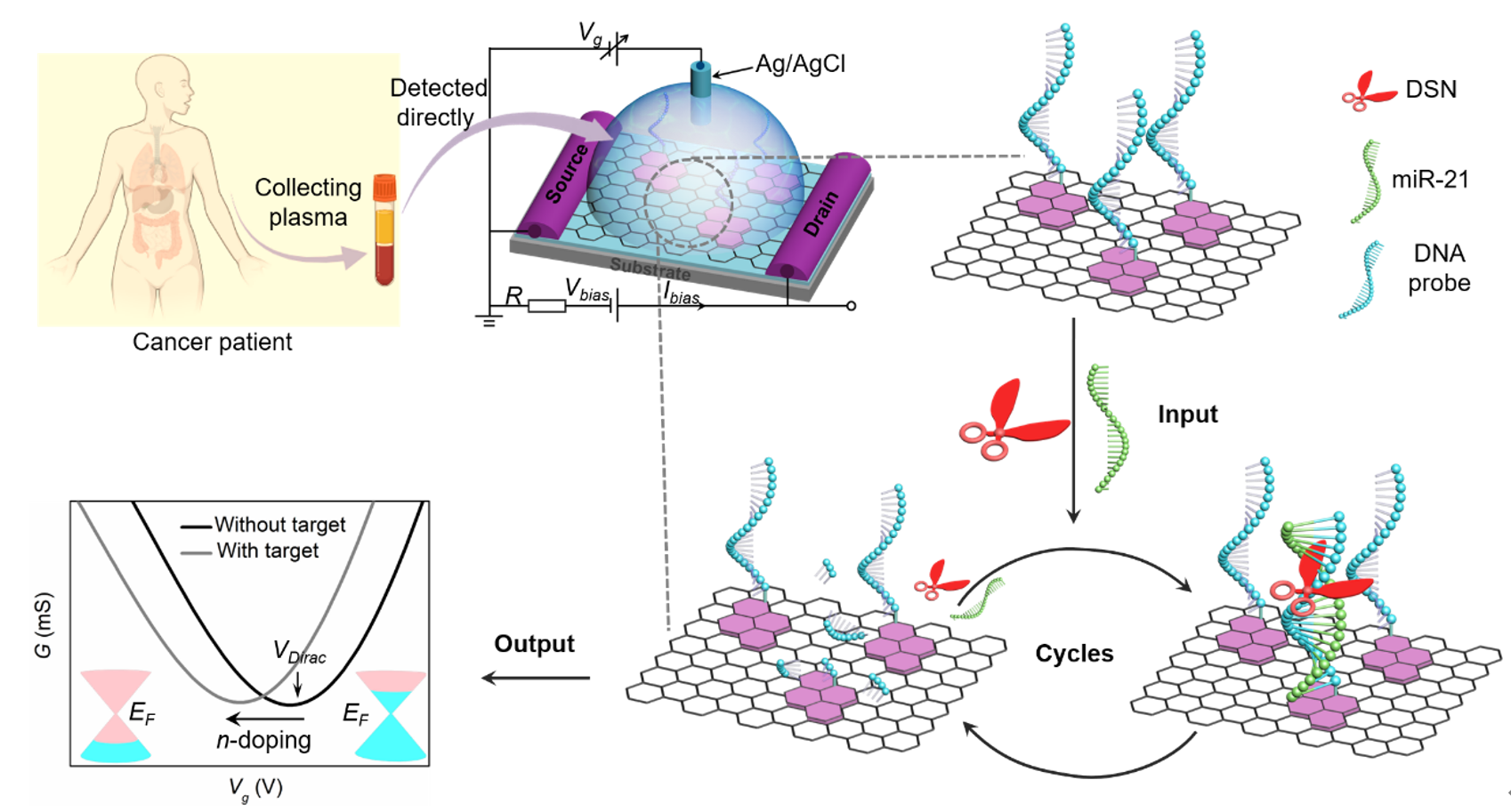 近日,清华大学材料学院与首都医科大学药学院合作,取得了miRNA检测技术的重要进展,成功建立了一种超灵敏的miRNA快速检测平台。该平台将双链特异性核酸酶(DSN)与洁净石墨烯原子层晶体管技术相结合,在实验室中实现了低至25aM浓度的miRNA检测。同时,该技术能够直接检测癌症患者临床血浆样本中的miR-21致癌基因,无需提取总RNA或进行预扩增,大幅简化了检测流程,为miRNA的快速灵敏现场检测提供了新途径。
