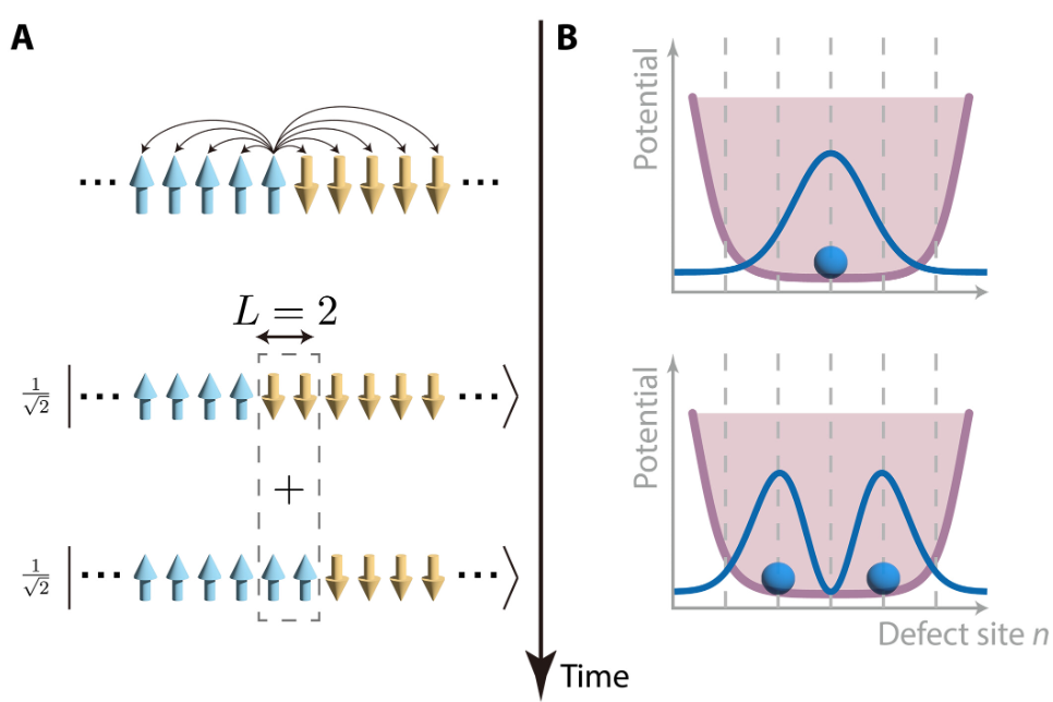 该工作中,研究人员通过对各个离子量子比特的单独寻址操控,在20个离子的一维离子链上制备了单个自旋扭结的初态。研究人员进而利用长程相互作用的横场伊辛模型实现平缓的自旋扭结有效势场,观察到自旋扭结在动力学演化过程中由于量子干涉效应分裂成位于不同位置的叠加态。