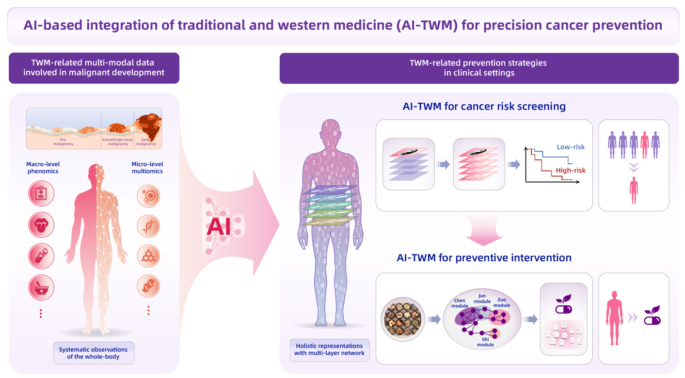 清华新闻网11月7日电 早期有效防治对于降低肿瘤发生率至关重要,其核心挑战在于如何精准预警肿瘤发生风险并给予有效干预。中医强调“未病先防、既病防变”,在肿瘤防治上具有整体观、治未病等特色理论与丰富的临床实践经验。随着生物医学研究进入人工智能时代,如何运用AI前沿技术,深入挖掘中医药在肿瘤防治上的特色理论与实践经验,形成中西医融合的肿瘤防治新范式?这既是中西医学面临的共性难题,也是人工智能与信息科学面临的重大挑战。