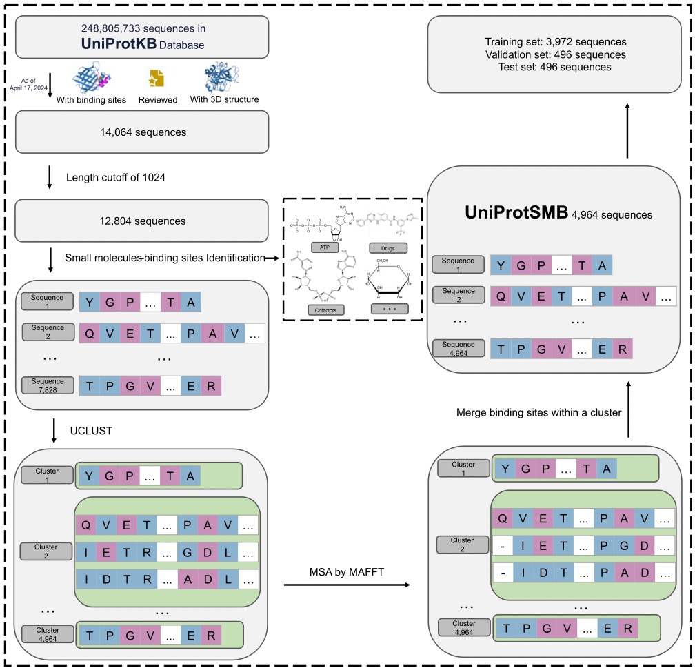 为了使CLAPE-SMB有更好的泛化能力,田博学课题组构建了UniProtSMB数据集作为训练集。研究人员从UniProtKB数据库中筛选出具有三维结构和小分子结合位点的实验验证蛋白质,去除长度过长的蛋白质并标注标签。随后,进行聚类去除冗余蛋白,形成UniProtSMB数据集。最后,将UniProtSMB数据集划分为训练集、验证集和测试集。