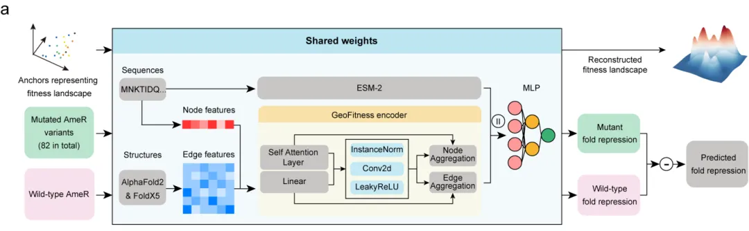 为了理解和重构这个高纬度复杂空间,研究人员设计了与EvoScan配套的深度学习算法,并命名为EvoAI。该方法结合了预训练的GeoFitness模型和蛋白质语言模型(ESM-2),加上多层感知器(MLP),以提高预测蛋白质突变效应的准确性。在本研究中EvoAI利用AmeR蛋白82个突变体的序列-功能映射信息对模型加以训练,并生成了不同于上述突变体的共1093个新蛋白,通过对于预测强度的排序,研究人员测试了预测强度最高的10个突变体,并将其与仅利用传统DMS方法预测得到的10个具备相同突变数量的,强度最高的10个突变体进行强度对比,结果显示,通过EvoAI预测得到的突变体均有显著的功能提升,而DMS方法得到的突变体多数均无显著功能提升,甚至某些突变体不再具备明显的抑制功能。这表明EvoAI系统识别到了通过信息压缩得到的高维度蛋白信息,并有效地生成了具备功能的突变体。