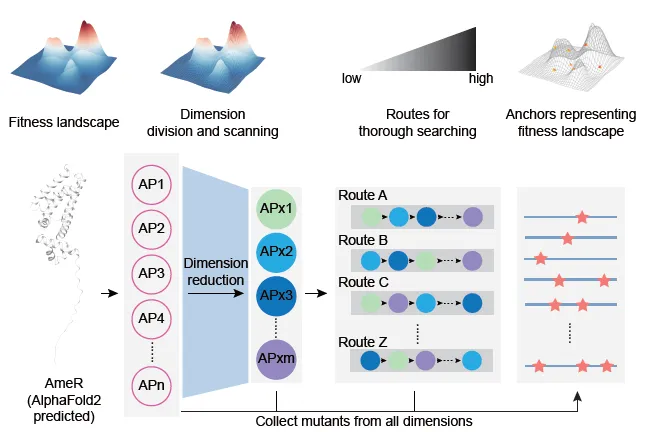 研究人员首先构建了进化搜索系统(Evolutionary Scanning, EvoScan)用以对蛋白进行分区域定向进化。该系统改造了噬菌体辅助的连续定向进化系统(PACE)。其中,突变体系来源EvolvR系统中enCas9-PolIM5复合蛋白,通过构建其诱导表达体系来创建靶向分区域突变质粒(TP)。为了测试系统的可行性,研究人员先后利用了绿色荧光蛋白EGFP的纳米抗体突变体的回复突变实验测试蛋白-蛋白相互作用的靶向进化,以及利用SARS-CoV-2主蛋白酶Mpro蛋白对其抑制剂的逃逸效应的进化测试蛋白-配体相互作用的靶向进化,证明该系统可以对gRNA覆盖的上下游约30bp的区域进行靶向进化并得到功能提升的突变体。随后,研究人员利用EvoScan进化了转录因子AmeR对于特定DNA序列的抑制能力,设计了13条gRNA对于蛋白进行区域分割,最终在8个区域中找到氨基酸突变。研究人员对这些区域进行随机排序,构建了8个不同的进化路径,使进化过程可以遍历以上8个区域,最终产生了82个功能提升、维度各不相同的锚点,并对上述锚点进行基于流式荧光的功能测试,系统生物学分析以及上位效应(Epistasis)的分析与计算等。结果显示,尽管绝大多数突变对于蛋白功能都有不同程度的提升,但不同的单点突变对于不同的突变组合而言,产生的功能效应并非都是提升,一些突变位点能够提升蛋白功能,但会干扰其他的突变位点的效应,这反映了蛋白质序列空间的高复杂度。