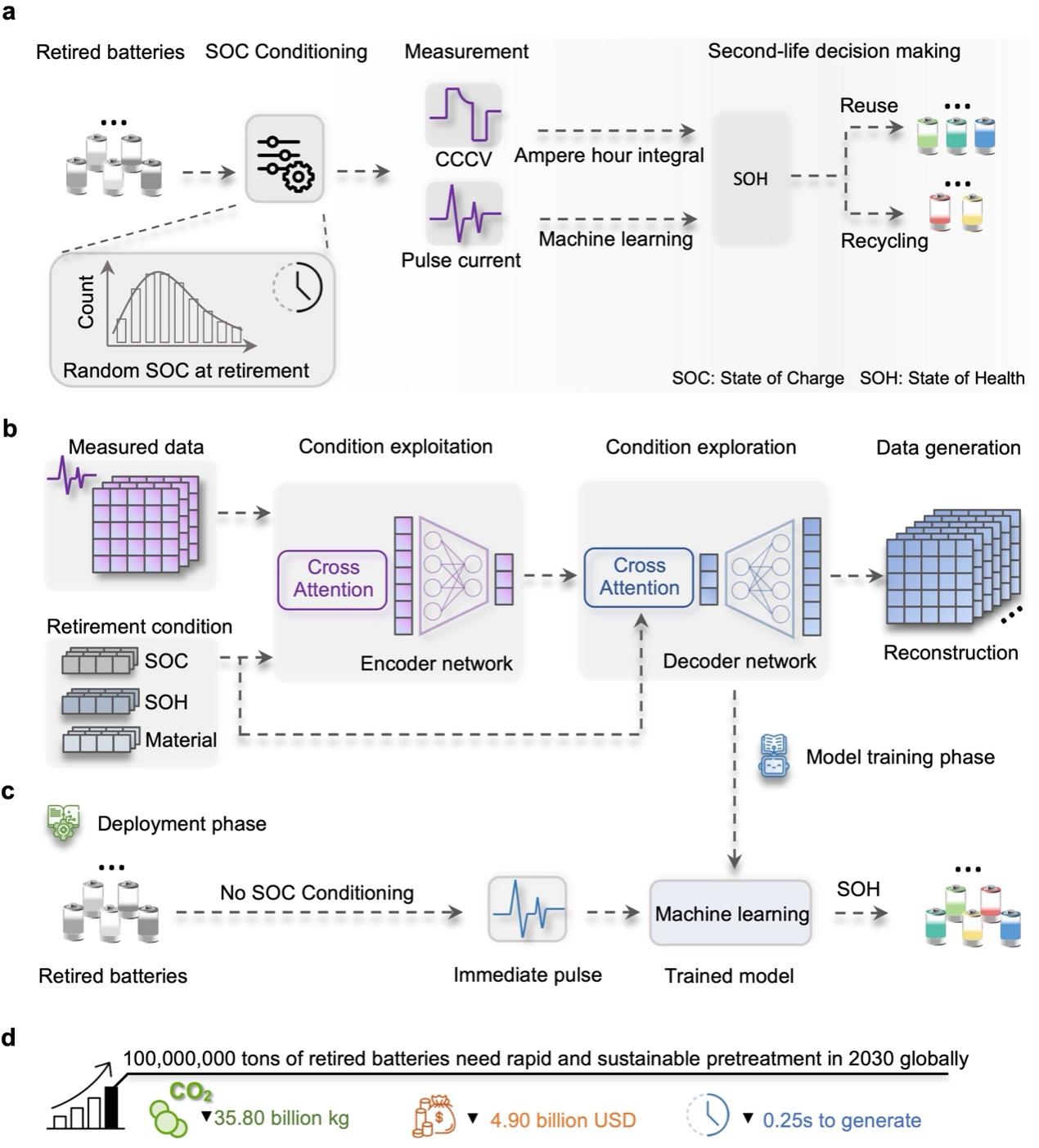 相关研究成果以“随机退役条件下基于生成式学习的电池健康状态评估与可持续回收”(Generative learning assisted state-of-health estimation for sustainable battery recycling with random retirement conditions)为题,于11月23日发表于《自然·通讯》(Nature Communications)上。
