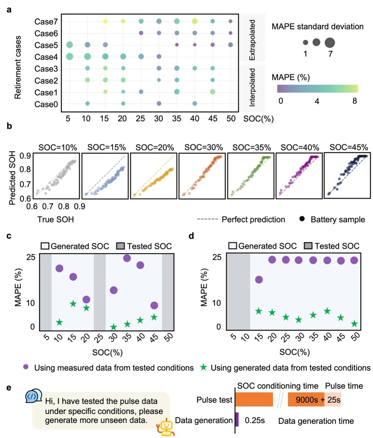 团队通过生成式机器学习方法,在少量已测量数据的基础上,实现了未测量数据空间的精准探索。模型利用已有的脉冲电压响应数据进行训练,可生成不同SOC条件下的新脉冲电压响应数据(图3)。实验表明,无论在内插还是外推场景中,生成数据的平均绝对百分比误差(MAPE)均低于2%,充分证明了模型对已测量数据分布的有效学习能力及其生成多样化数据样本的潜力。