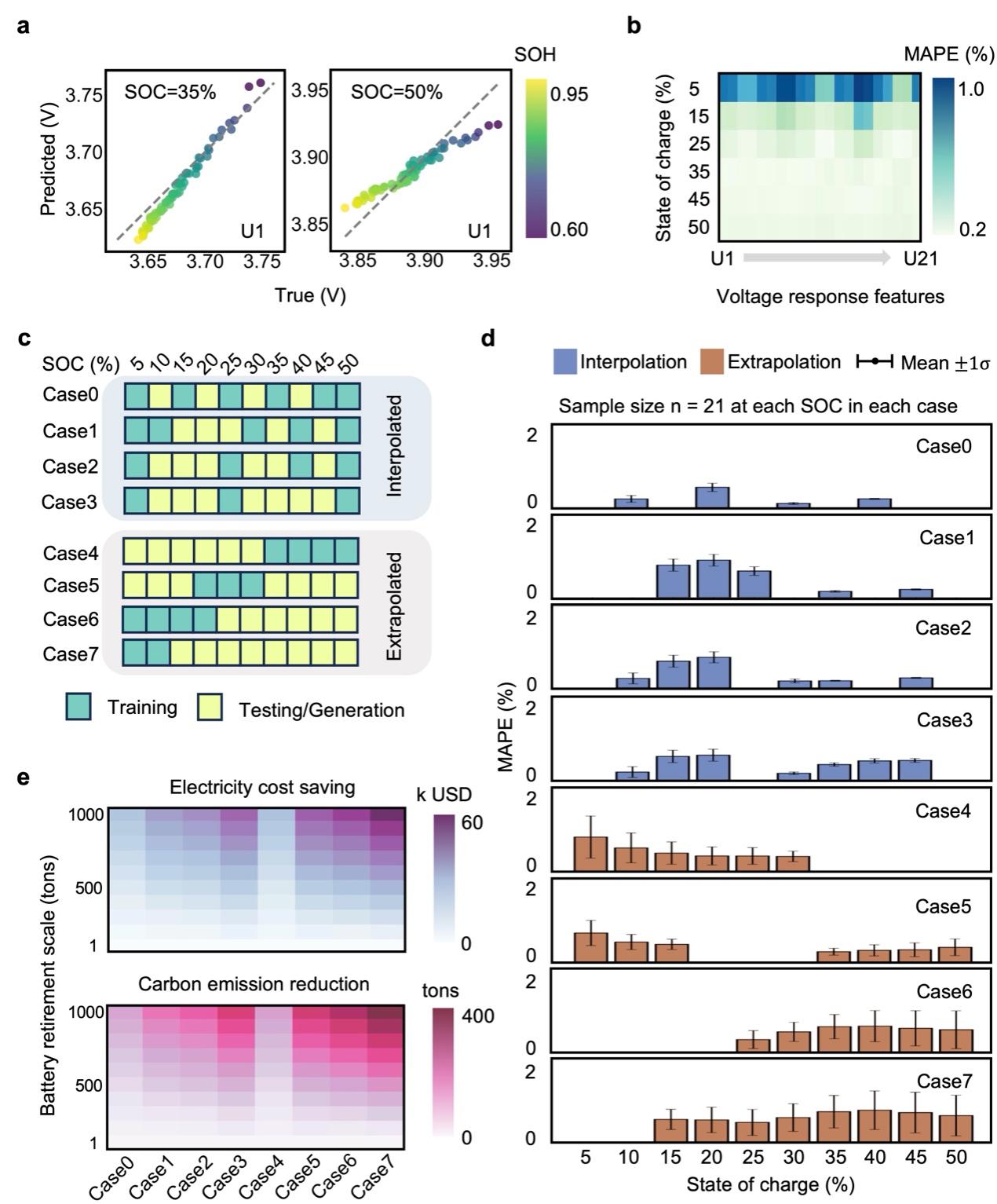 与传统的CCCV测试相比,基于生成模型的脉冲测试方法无需耗费大量时间调整SOC,也避免了对退役电池的额外损害。技术经济评估显示,在2030年全球动力电池退役场景下,该生成式机器学习辅助的SOH估计方法可节省约49亿美元电力成本,减少358亿公斤二氧化碳排放(图5)。这一方法在时间效率、能耗降低、环境效益和操作灵活性方面展现了显著优势。