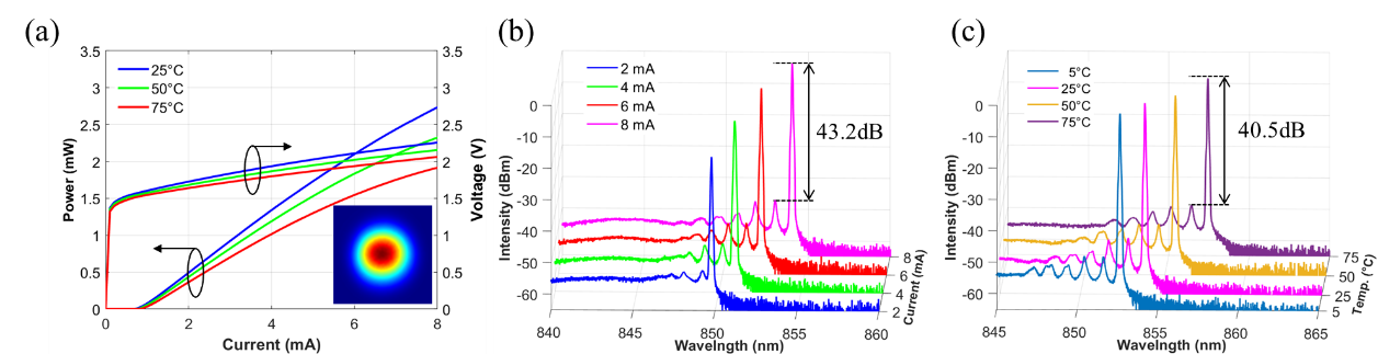 研究团队研发的单模VCSEL在不同温度和电流条件下展现出优异的功率输出特性和光谱稳定性(图3)。测试结果表明,该VCSEL在25°C、50°C和75°C的温度范围内能够保持稳定的输出功率,同时在光束模式方面表现出良好的模式控制能力。进一步测试显示,在2-8mA电流范围和5-75°C的工作温度下,其边模抑制比(SMSR)始终高于40dB,充分体现了其在模式选择性和稳定性方面的显著优势。这些特性使其能够满足短距离高速光互连应用对输出稳定性的严格要求。