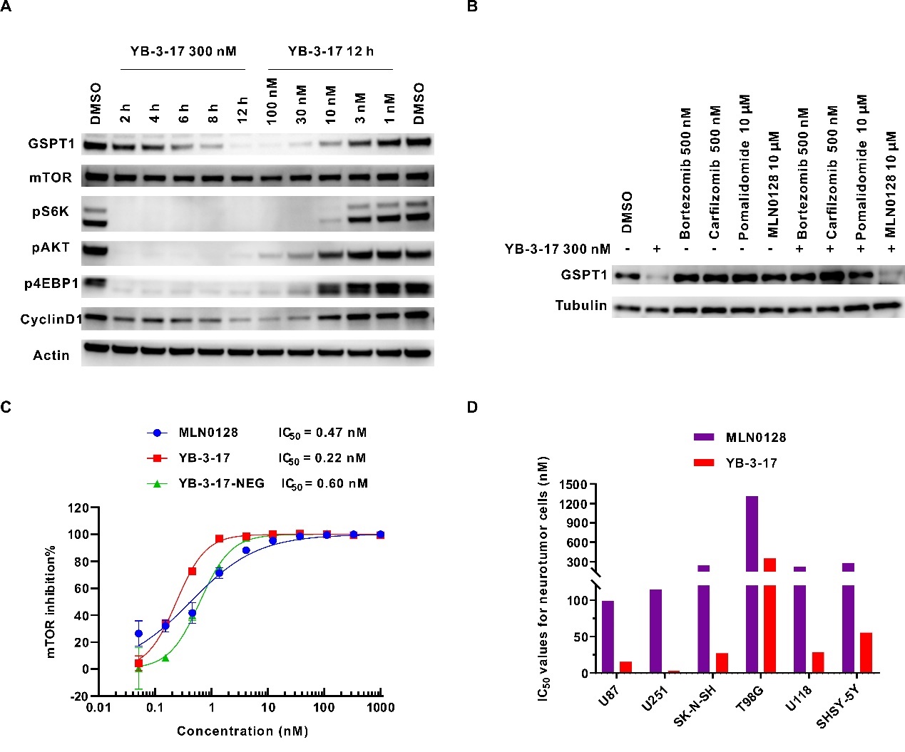 随后,研究人员对YB-3-17进行了进一步的生物学活性评估以及机制验证。YB-3-17能明显抑制mTORC1/2复合物并降解GSPT1,显著抑制其下游蛋白的磷酸化水平,并且呈现出良好的时间和浓度依赖性(图2A)。YB-3-17能够在低至10 nM的浓度下有效降解GSPT1,DC50仅5 nM。此外,rescue竞争性实验表明YB-3-17诱导GSPT1降解依赖于泛素蛋白酶体系统(图2B)。研究人员还测试发现YB-3-17对mTOR的酶活IC50仅为0.22 nM,甚至略优于抑制剂MLN0128(IC50= 0.47 nM)(图2C)。同时,研究人员发现YB-3-17能够有效抑制多种神经肿瘤细胞的增殖,IC50值低至3.3 nM(图2D),优于单靶点mTOR抑制剂(MLN0128)、GSPT1降解剂,以及它们的联合治疗(图1D),显示出作用于双靶点的协同效应。