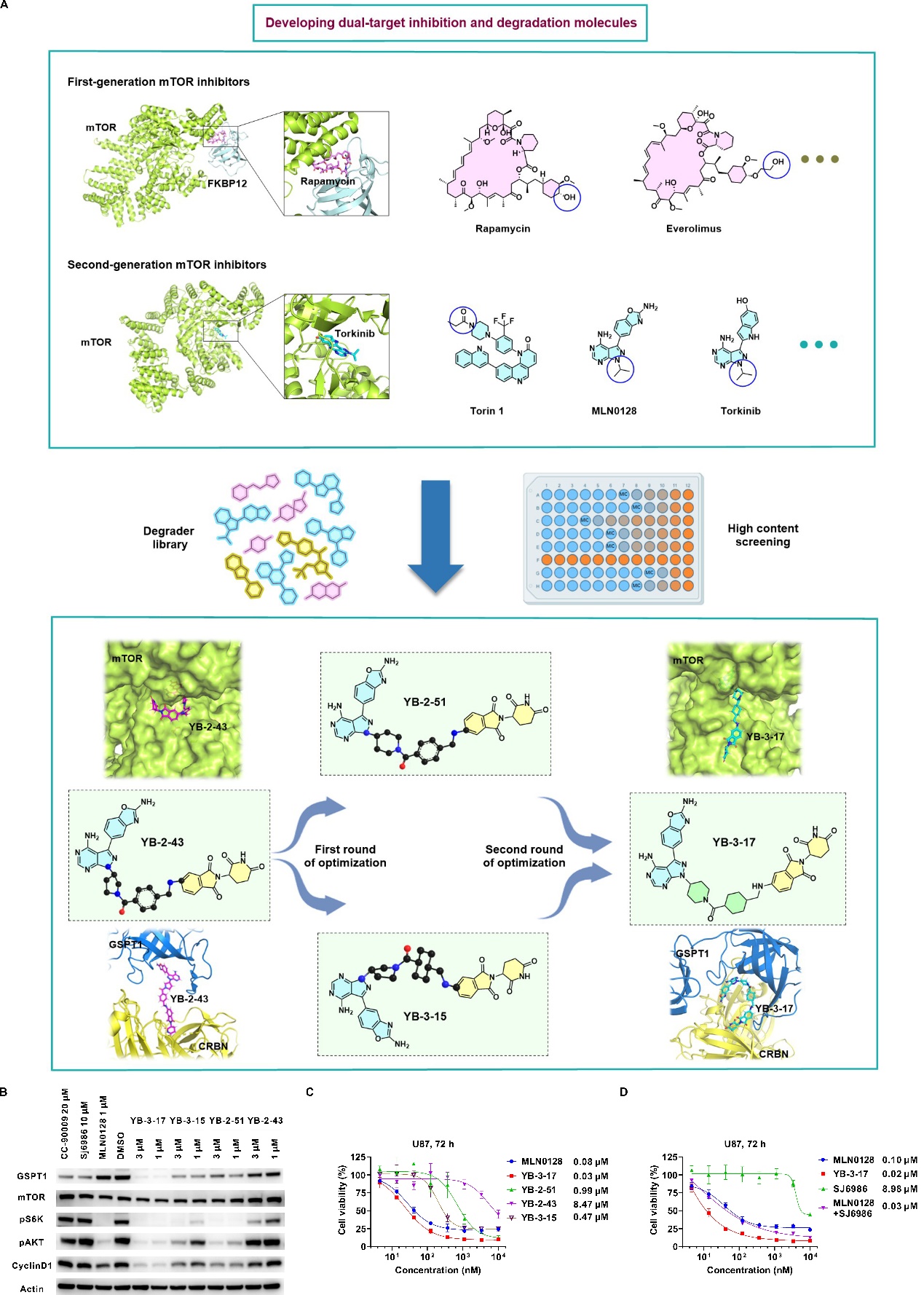 研究人员提出了同时抑制并降解两种不同靶蛋白的双靶双机制小分子设计策略,创新地开发了小分子YB-3-17。该分子能选择性且高效地抑制mTOR并降解GSPT1。与临床中mTOR抑制剂MLN0128相比,YB-3-17在体内外的抗肿瘤效果均具有显著优势且安全性更佳。YB-3-17以“一石二鸟”特性实现了“事半功倍”的效果,验证了双靶点、双机制策略的可行性,为脑胶质瘤提供了新的治疗思路。