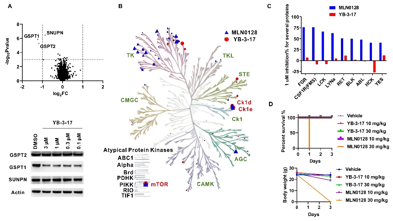 研究人员对YB-3-17选择性进行了进一步的详细评估。通过蛋白质组学和激酶谱实验表明了YB-3-17同时具有优良的GSPT1降解和mTOR抑制选择性(图3A, B, C)。基于此,研究人员还做了一个初步的体内实验对YB-3-17的安全性进行了测试(图3D)。30mg/kg的mTOR抑制剂MLN0128给药一次会导致小鼠死亡,10mg/kg的MLN0128连续给药三天则导致小鼠体重显著下降。与之相比,30mg/kg的YB-3-17连续给药三天小鼠依然状态良好,表明YB-3-17具有较高的体内安全性,也进一步反映出其优良选择性。