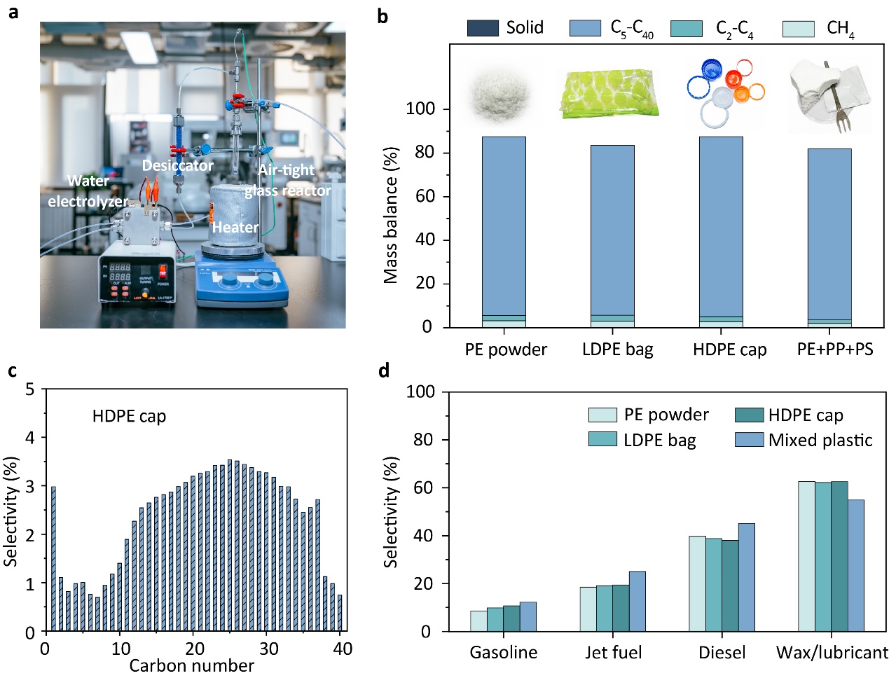 近日,清华大学化工系牛志强课题组在废旧塑料催化升级回收领域取得重要进展,在低氢气压力甚至常压条件下,将废弃聚乙烯(PE)高选择性地转化为液体燃料、蜡和基础油,提出并验证了“绿氢+废塑料=液体燃料”的分散式资源升级回收路线(图1)。
