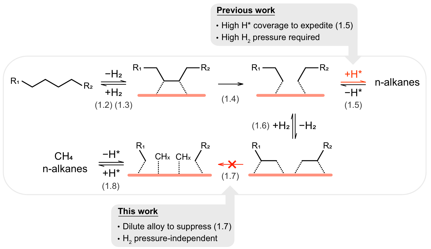 聚乙烯氢解通常需要高压氢气才能避免低值产物甲烷的产生。通过对烷烃氢解反应路径的分析,课题组提出了控制产物选择性的新策略(图2):在贫氢条件下,可通过抑制连续C-C键断裂来减少甲烷产量。基于上述分析,课题组设计并开发了RuPt稀合金催化剂,通过Pt原子稀释催化剂表面的Ru位点,减缓了氢解过程中C-C键的二次断裂,提高了氢解产物中高值长链烷烃的选择性。此催化剂可以在低氢气压力甚至常压条件下,实现对聚乙烯的高选择性升级转化。