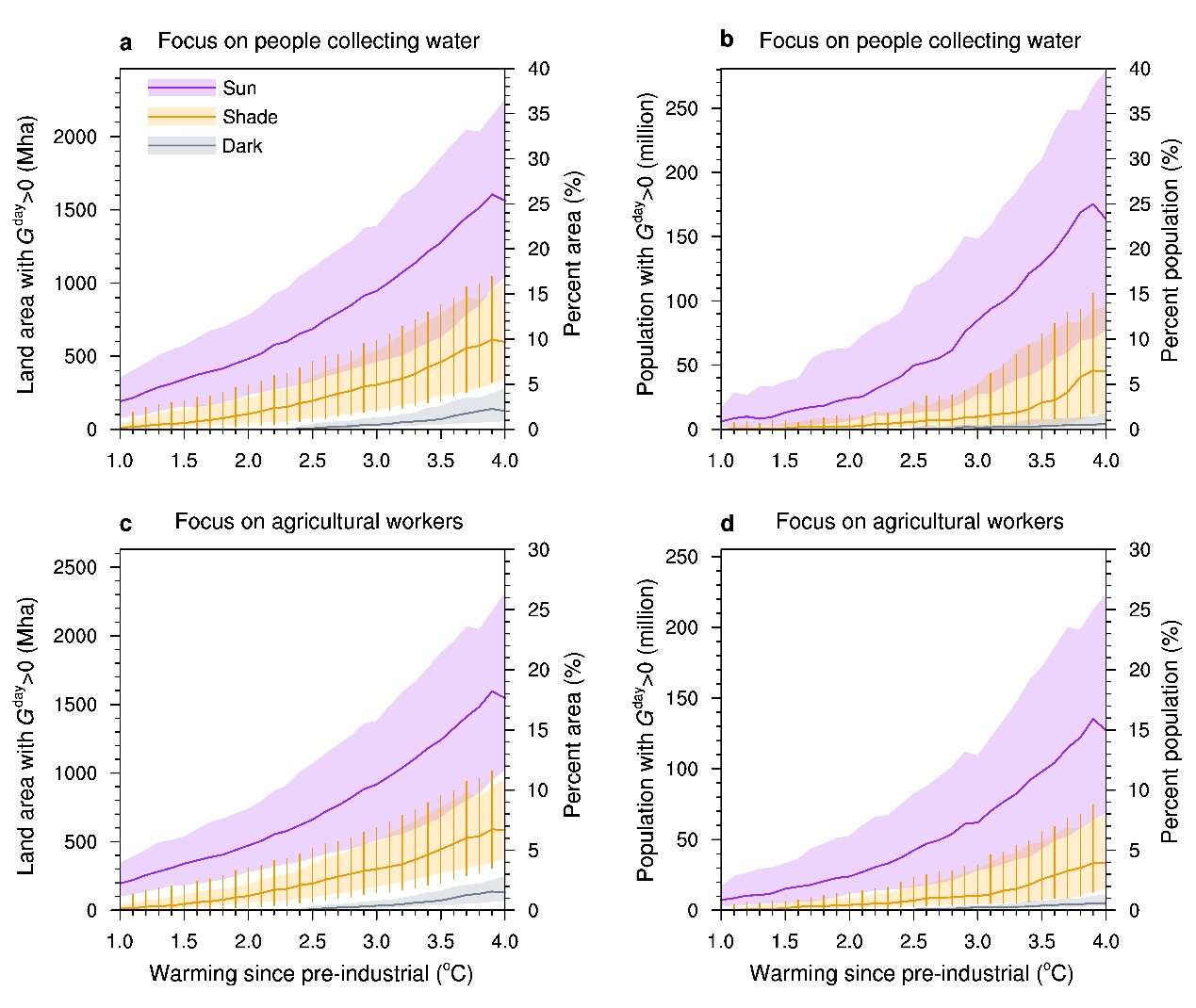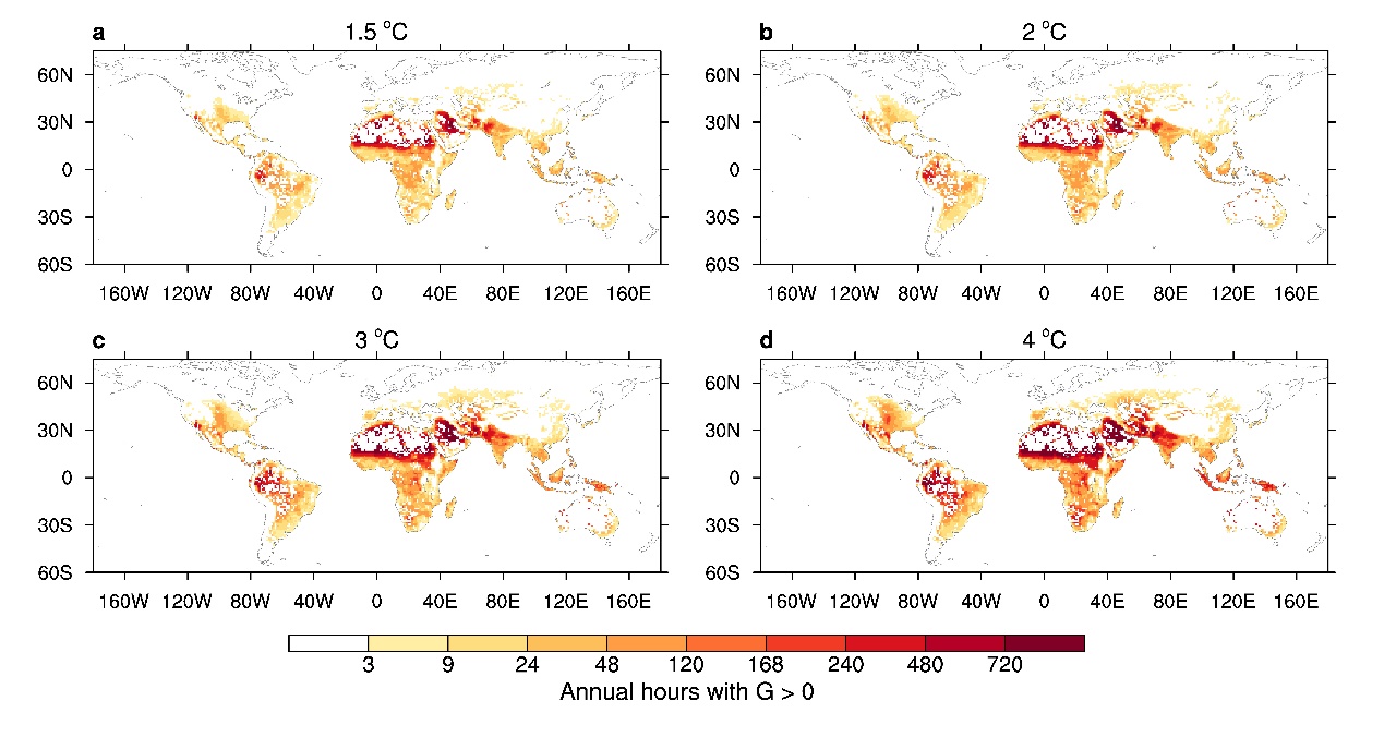 研究发现,本世纪预期面临不可补偿热应激的户外活动人口将比以往室内研究多出数千万。具体来说,在全球变暖2°C的情景下,预计有2400万农民或户外取水的人口(图2b,d)平均每年将经历8天(或96小时,图3b)不可补偿热应激。当升温4°C时,将有1.3亿农民或1.6亿户外取水人口平均每年受到14天(或168小时,图3)不可补偿热应激的影响。如果考虑其他户外活动人口如建筑工人或快递员,或老年及亚健康人群,影响将更为广泛。即使在有遮阳条件下,暴露于不可补偿热应激的人口数量也比此前完全忽视辐射影响的研究预测高出六倍以上。热带地区,尤其是南亚、非洲北部、南美和中东部分地区将首当其冲,中国华东华南地区也在接近这些危险条件(图3)。