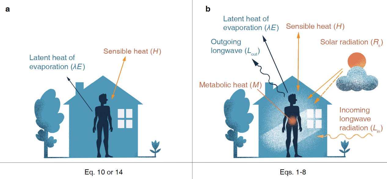 研究团队开发了一套精确且简约的人体热响应模型,首次将温度、湿度、太阳辐射和风速等户外动态环境因素和几种关键的生理约束同时纳入考量(图1),并用第六次耦合模式比对项目(CMIP6)中的12个地球系统模式的未来气候预测作为输入进行全球热应激的定量评估。该方法的创新在于,传统热应激研究主要依赖于如湿球温度等描述人体外部因素的经验指数,其参数一般校准于当下气候和特定人群,无法外推到未来或其他人群,而该团队所开发的模型直接描述人体反应并可适用于任何气候情景和人群。