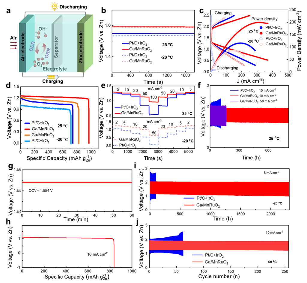 基于Ga/MnRuO2催化剂的a-r-ZABs在宽温域内展现出优异的性能(图3)。其中,在常温10 mA cm-2的电流密度下经过800多个小时循环充放电测试之后,该催化剂依然保留86.7%的初始比容量值。另外,该催化剂在低温下进行2308小时(约13848个循环)循环充放电测试之后,几乎无衰减。研究提出了一种双向调控策略,为发展高性能双功能ORR和OER催化剂及锌空气电池提供了一种新思路。