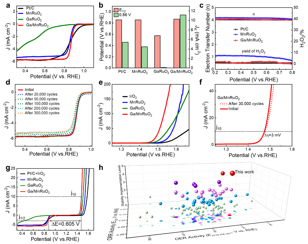课题组基于简单的葡萄糖-尿素鼓泡法(图1)开发了一种双向调控策略,通过同时在RuO2中引入元素Ga和活性位点Mn,利用Ga从原子水平上对双活性位点Ru和Mn的价态结构进行优化,突破了传统双位点活性与稳定性之间的限制。研究人员结合实验和理论分析证实了Ga的引入造成了双活性位点Mn和Ru上的电子/电荷再分布,优化了Mn和Ru的价态结构,通过调控反应中间产物*O/*OH在活性位点上的吸附行为降低了ORR和OER反应的能垒。研究人员所开发的Ga/MnRuO2催化剂表现出优异的双功能催化性能(图2),其电位差(ΔE)仅为0.605V,显示了优异的催化活性,其中ORR性能经过30万圈加速测试之后衰减仅为18mV。将该催化剂与100篇近期的双功能催化剂进行对比,其综合性能优于大部分催化剂。