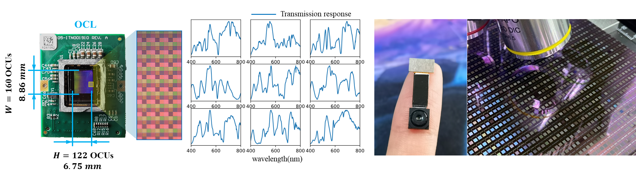制备的基于光谱卷积神经网络的物谱芯片如图2所示,分别采用了光学超表面以及色素作为光谱调制结构,制备了两款不同的物谱芯片,验证了光谱卷积神经网络框架的可行性。其中基于超表面的芯片具有更好的光谱调制能力,并且具有偏振、相位、入射角等全光场感知的潜力,而基于色素的芯片已实现了12吋晶圆的流片量产,具有更高的集成度和更低的加工制备成本。光谱卷积神经网络方案主要有三点优势:(1)基于图像传感器实现的光计算卷积层集成度大、功耗低,且可以直接感知自然光(包含两个空间维度和一个光谱维度的宽带非相干光),不依赖于相干光源;(2)光计算卷积层为感算一体式,即图像传感器完成拍摄的同时也完成了计算,能够在算力有限的边缘设备与移动终端上完成高维光谱图像的获取与处理,实现“物质超成像”(Mattermeta-imaging),摆脱GPU、不被卡脖子,让光谱成像的应用轻松下沉到终端;(3)光电混合的计算架构能够兼顾光计算高速、并行、低功耗的优势以及电计算的灵活性,充分利用图像传感器作为目前最高集成度的光电探测阵列芯片,让上百万像素、上亿像素相机的每一个像素点都可以计算。