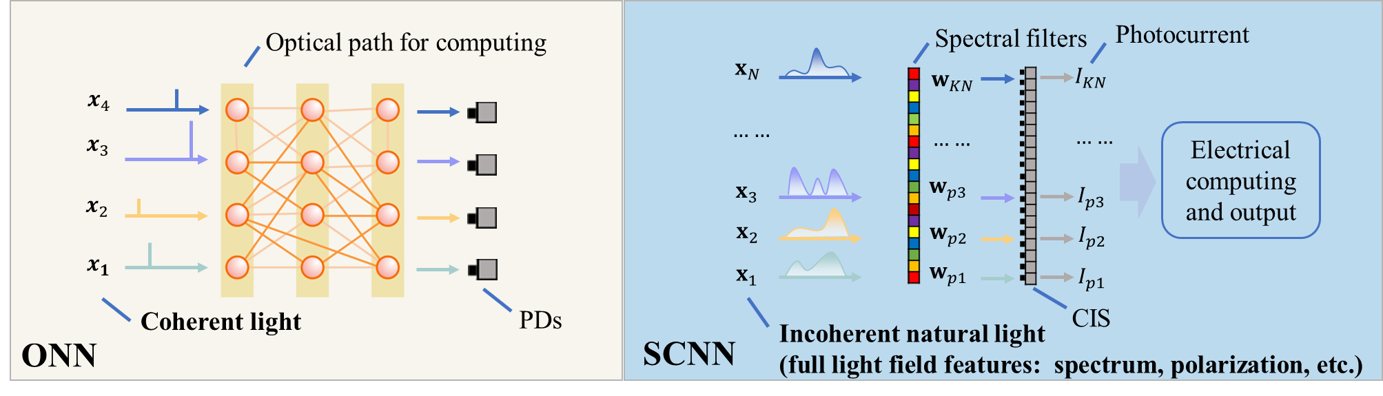 图1.现有的光神经网络(ONN)与论文提出的光谱卷积神经网络(SCNN)的对比