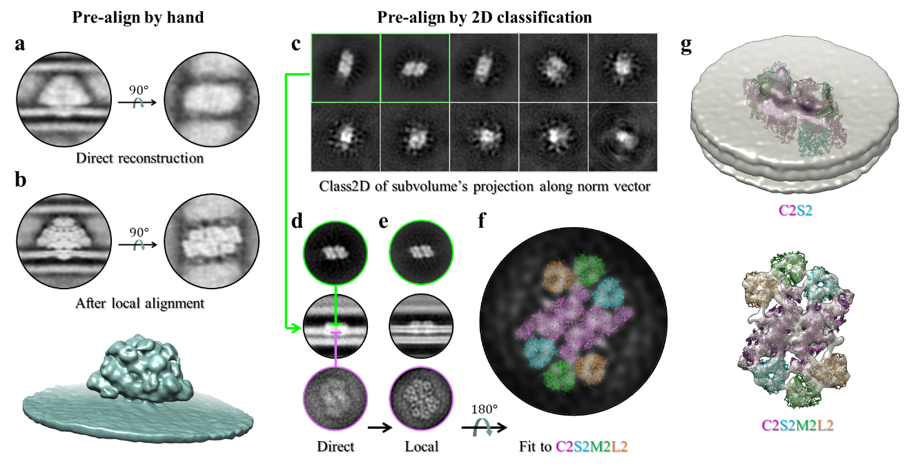 MPicker还可以提供每个颗粒的初始取向用于辅助膜蛋白STA的计算。除了常规的膜法向量,用户还可以方便地通过MPicker在展平tomogram中标注蛋白在膜表面的面内取向,从而利用更强的角度约束来辅助STA的计算。为提高取向确定的自动化程度,研究团队将膜蛋白沿膜法向量投影,并进行了改造的二维分类,从而更高效地获得每个颗粒的精准取向信息。通过这一方法,团队使用四套tomogram数据成功解析了衣藻PSII-LHCII超复合物的低分辨原位结构(图3),并将结果上传至EMDB数据库(EMD-61019)。