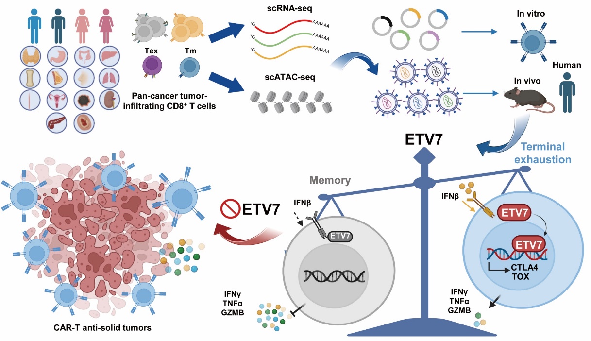 肿瘤病人单细胞多组学与筛选鉴定到ETV7作为调控CD8+T细胞命运的转录焦点,促进CD8+T细胞的终末分化(耗竭)与功能缺失。靶向ETV7有效增强CAR-T杀伤实体瘤的效率