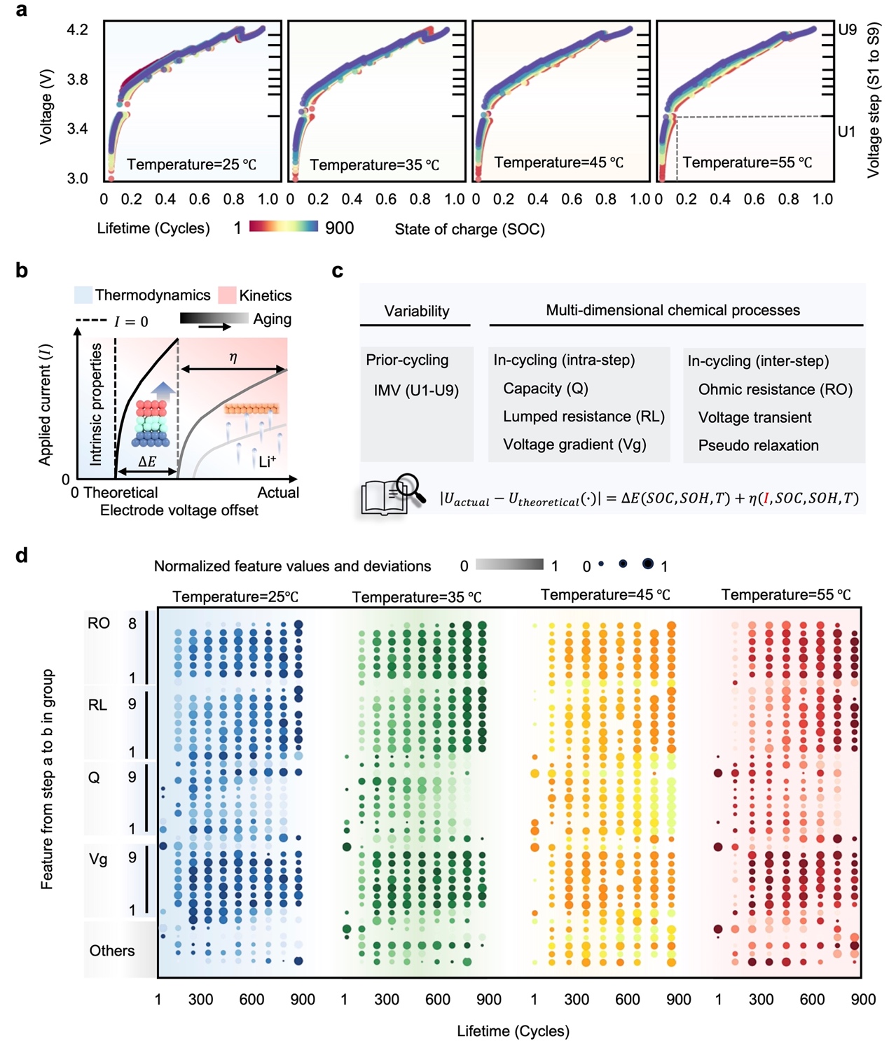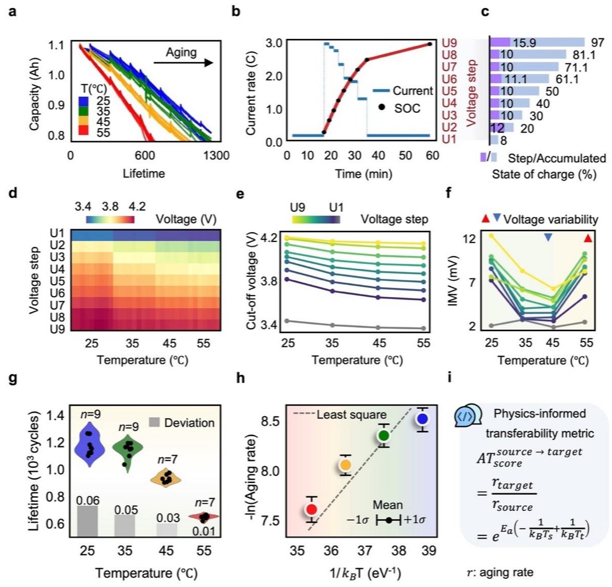 团队采用与电动汽车快速充电兼容的多步充电方案,范围从0.33C到3C,共包含9个步骤。其中的截止电压(U1-U9)代表每个荷电状态即SOC的充电接受程度,并在25℃、35℃、45℃和55℃四个温度下进行测试(图3)。