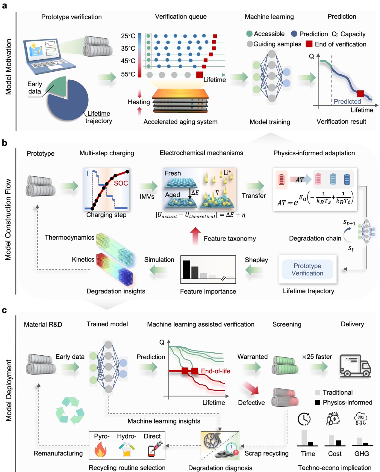 在电池制造领域,传统的容量校准方法在原型验证时需耗费大量时间。同时,制造的不一致性和电池老化的多样性,使得电池原型的性能评估变得极为复杂。为此,清华大学深圳国际研究生院张璇、周光敏、李阳副教授团队与合作者提出了一种基于物理信息学习的电池衰减轨迹早期预测方法。该方法通过计算热力学和动力学参数,并将其关联至未来状态变化,从而实现对电池整个衰减轨迹的早期预测。与传统方法相比,该方法仅利用电池原型的早期循环数据(50次循环,占总寿命4%),即可达成95.1%全寿命平均预测准确率,将原型验证速度提升了至少25倍。