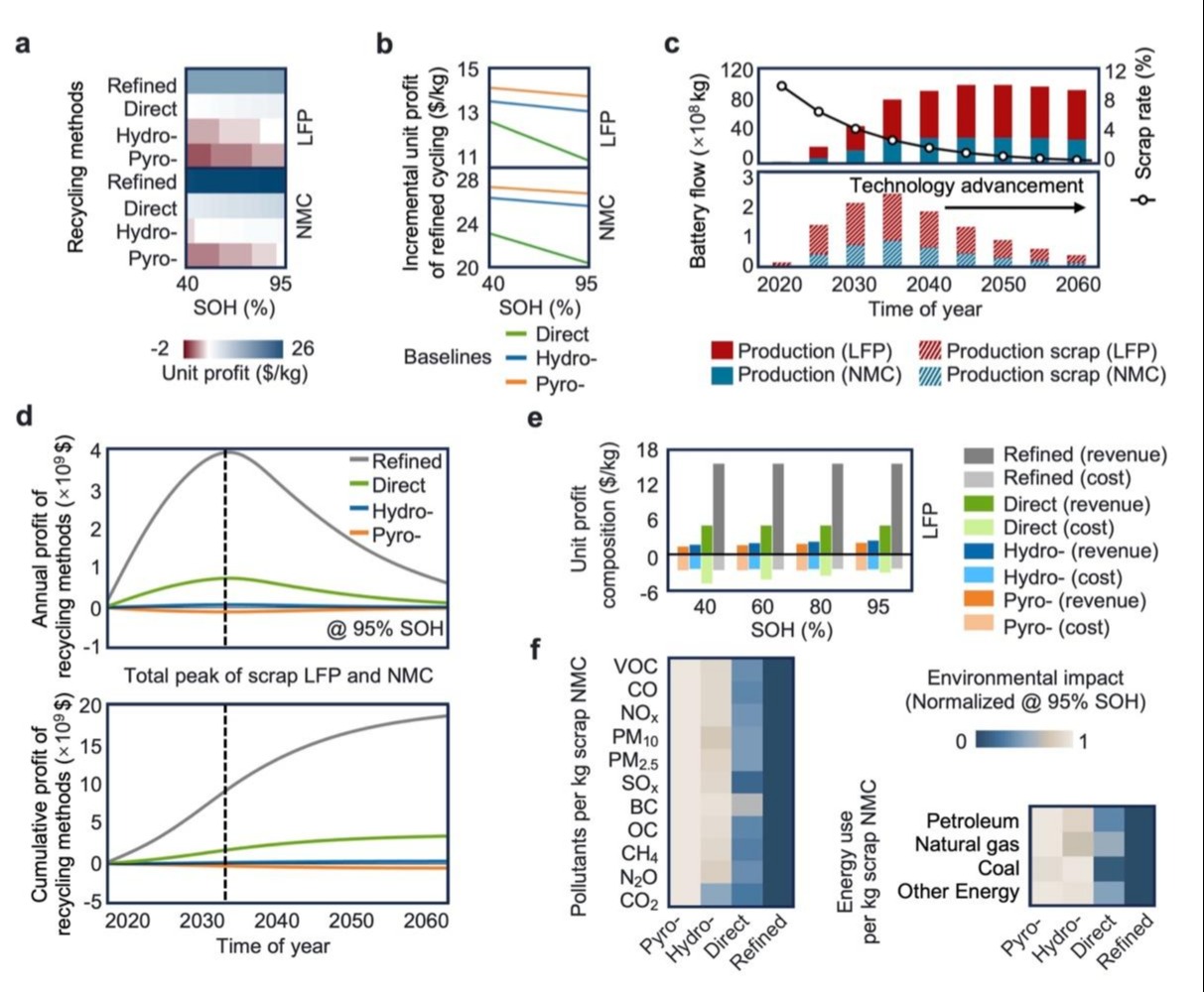 团队分析了利用所提出的物理信息学习模型进行电池生产制造环节的劣品检测和废料回收的技术经济性,其中重点分析了直接修复轻微衰减电池(健康状态即SOH>95%)的年利润、累计利润,以及不同SOH下回收的单位利润构成和环境能源影响。结果表明,所提出的模型对于生产制造环节的废料管理可持续性具有显著提升效果。