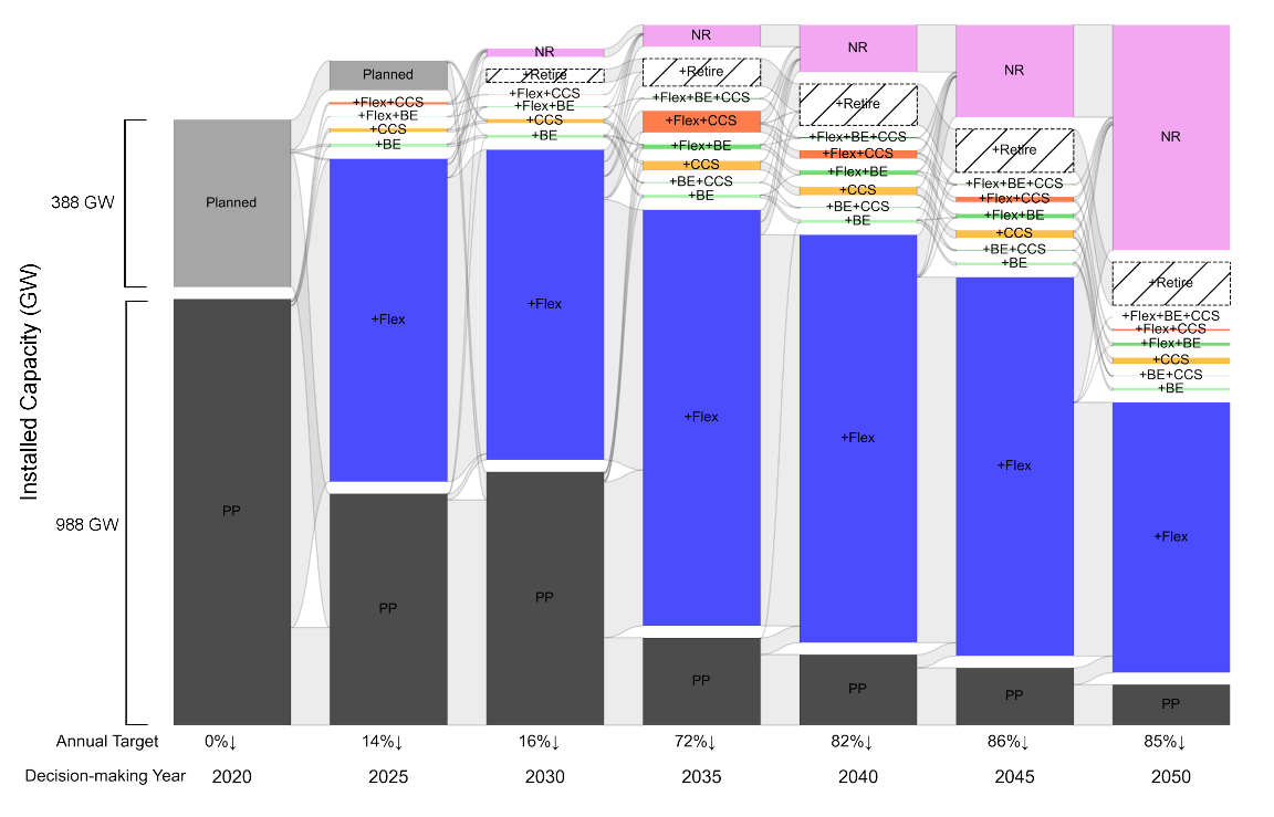 针对这一问题,清华大学地学系蔡闻佳教授课题组开发了一个厂级递归动态优化模型(PLAn T-level dynamic Optimization model, PLATO),旨在探究燃煤电厂在多种减排策略下递归动态的转型路径。在该模型中,燃煤电厂可根据自身的装机容量、投产时间、周围生物质资源量、距离碳封存点位的距离等特征,在多种减排策略中进行决策。同时,随着国家碳减排目标的提高,模型将帮助燃煤电厂开展多期的序贯决策。在这一模型基础上,通过构建多条满足相同累计碳减排目标的碳减排情景,研究探究了不同情景的曲线形态对厂级转型路径及其转型成本的影响。