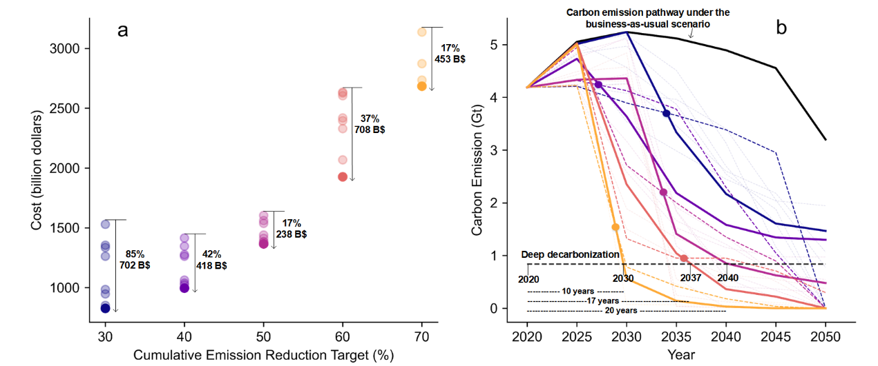 图3.各累计碳减排目标下成本更低的碳减排情景(图a表示不同累计减排目标下各碳减排情景的转型成本。图b表示不同累计碳减排目标下碳减排情景的曲线形态;实线表示低成本情景;虚线表示高成本情景;曲线颜色与图a对应;深度减排表示二氧化碳排放相比于2020年水平降低80%)