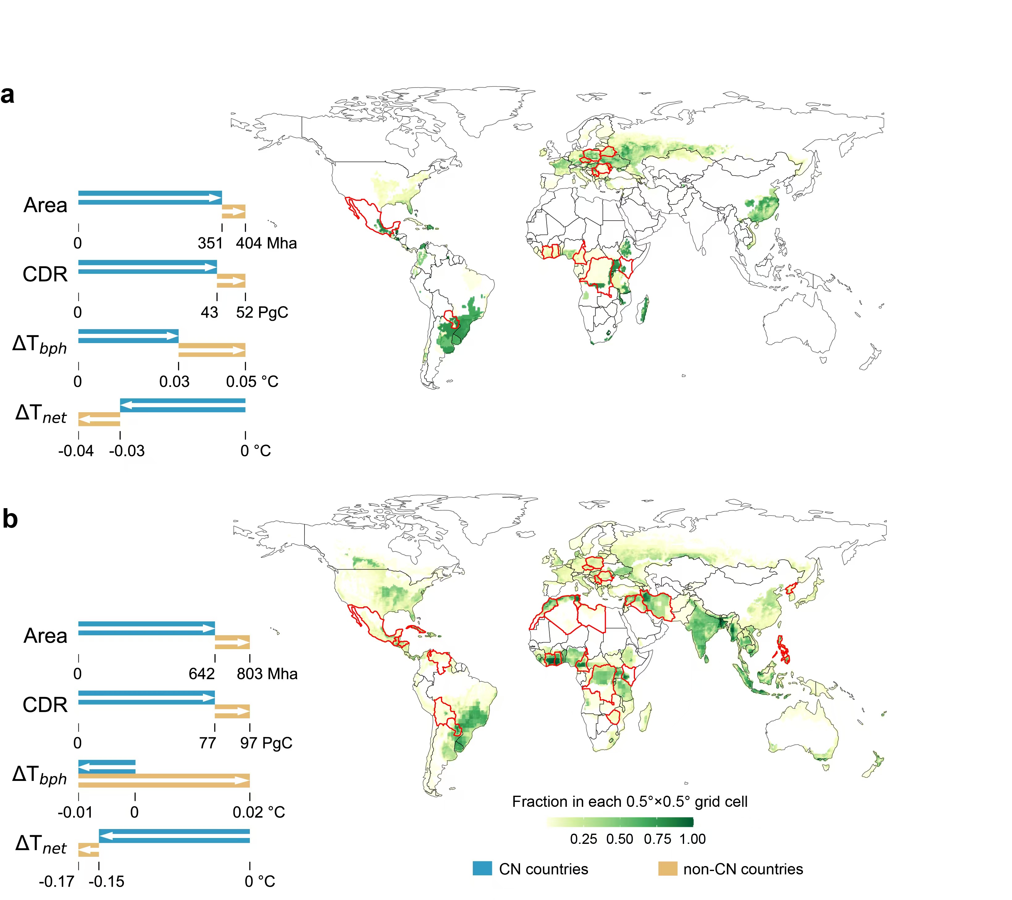 生物能源作物种植分布及碳中和与非碳中和国家对全球气候变化缓解的贡献(红色边框表示种植面积超过1公顷的非碳中和国家)