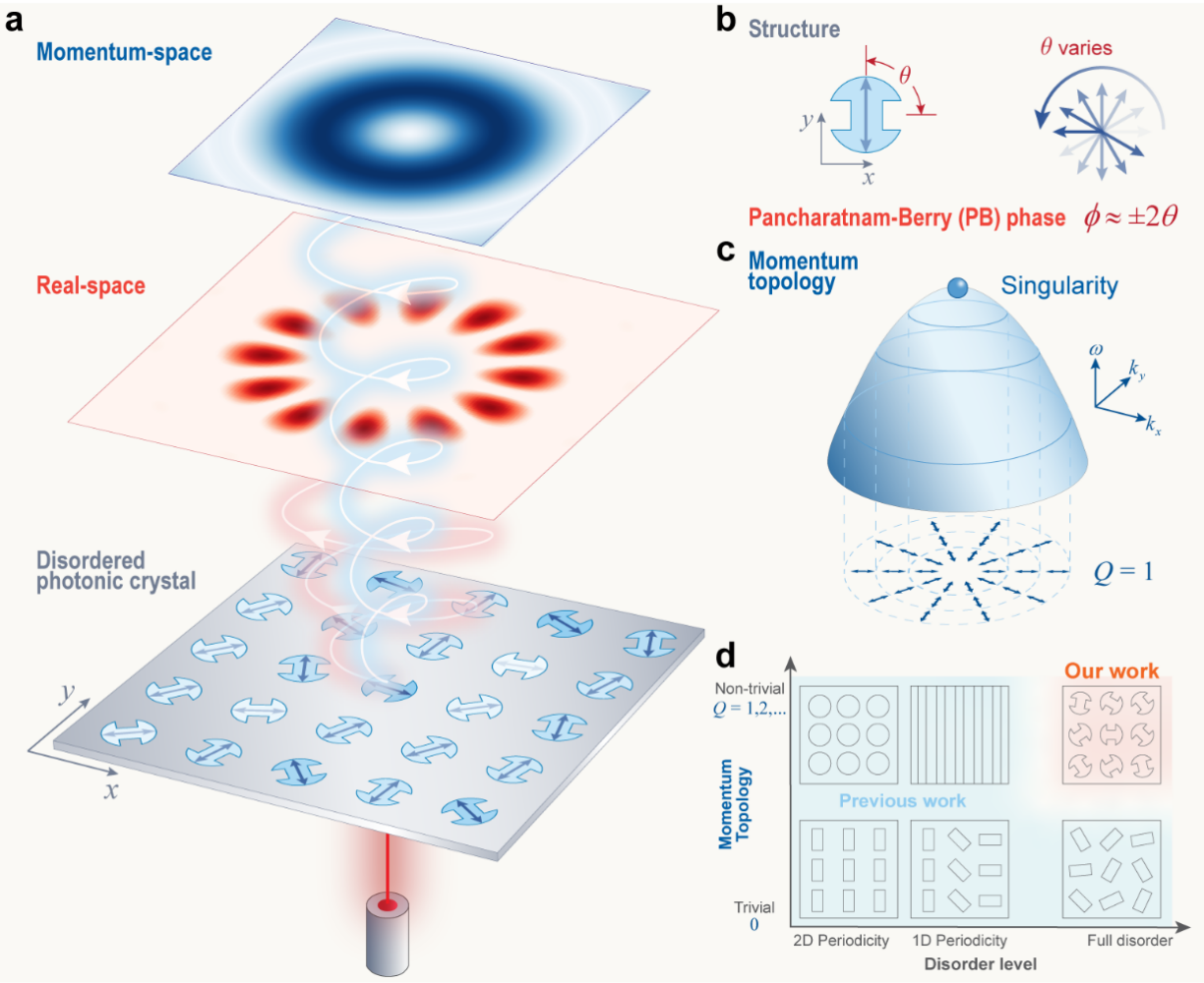 为了解决这一问题,清华大学深圳国际研究生院副教授宋清华团队联合新加坡国立大学教授仇成伟、洛桑联邦理工大学教授罗曼·弗勒里(Romain Fleury),首次提出了一种实动量拓扑光子晶体的概念(图1)。该研究提出了无序辅助的实动量拓扑光子晶体,为拓扑光学领域的应用开辟了新的方向,这一创新性研究有望推动光子芯片等微纳光学器件的发展,并可应用于高稳定性高容量的光通信技术、复杂结构光的生成、高维量子纠缠技术、生物粒子的精细光学操控、AR/VR显示器件等领域。