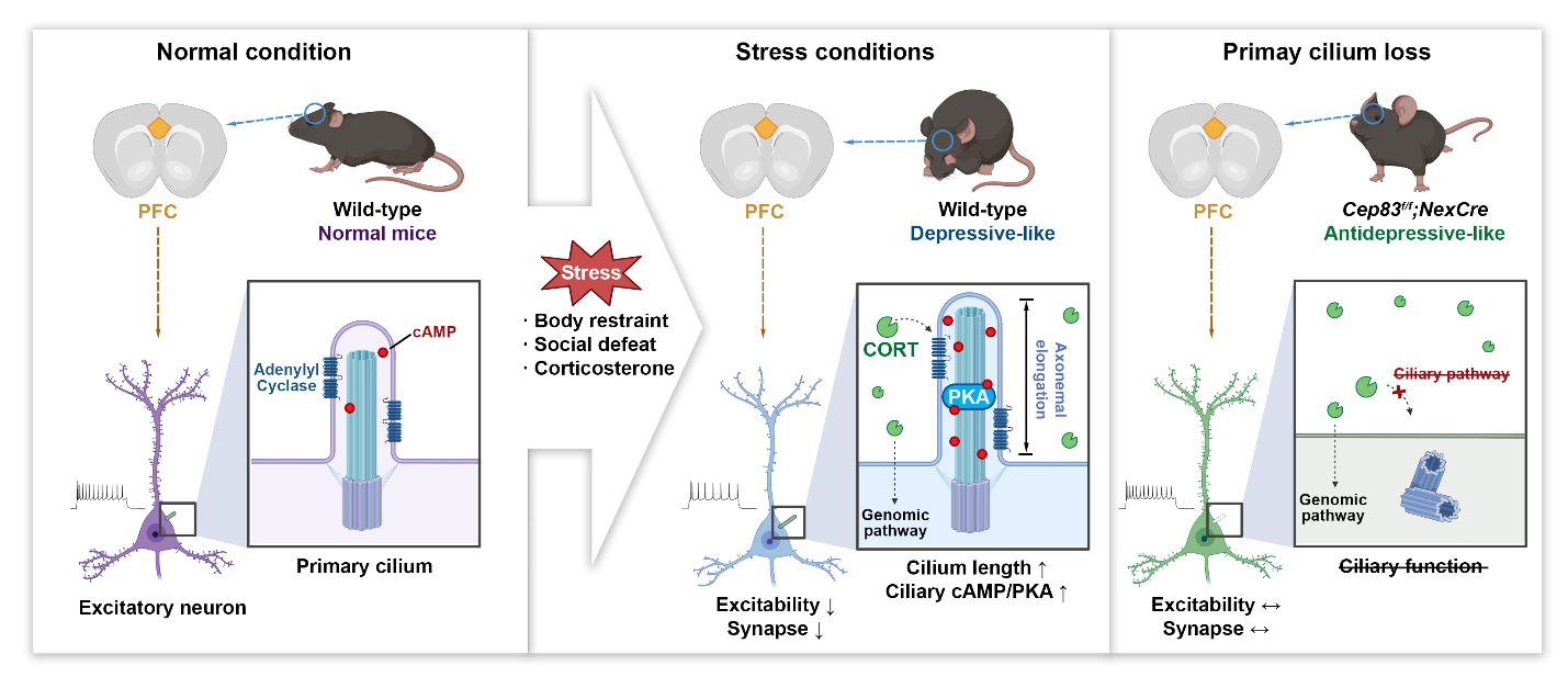 研究填补了对成熟大脑皮层中神经元初级纤毛功能认知的空白,并为理解动物压力感知和抑郁样行为的形成过程开拓了新的方向。