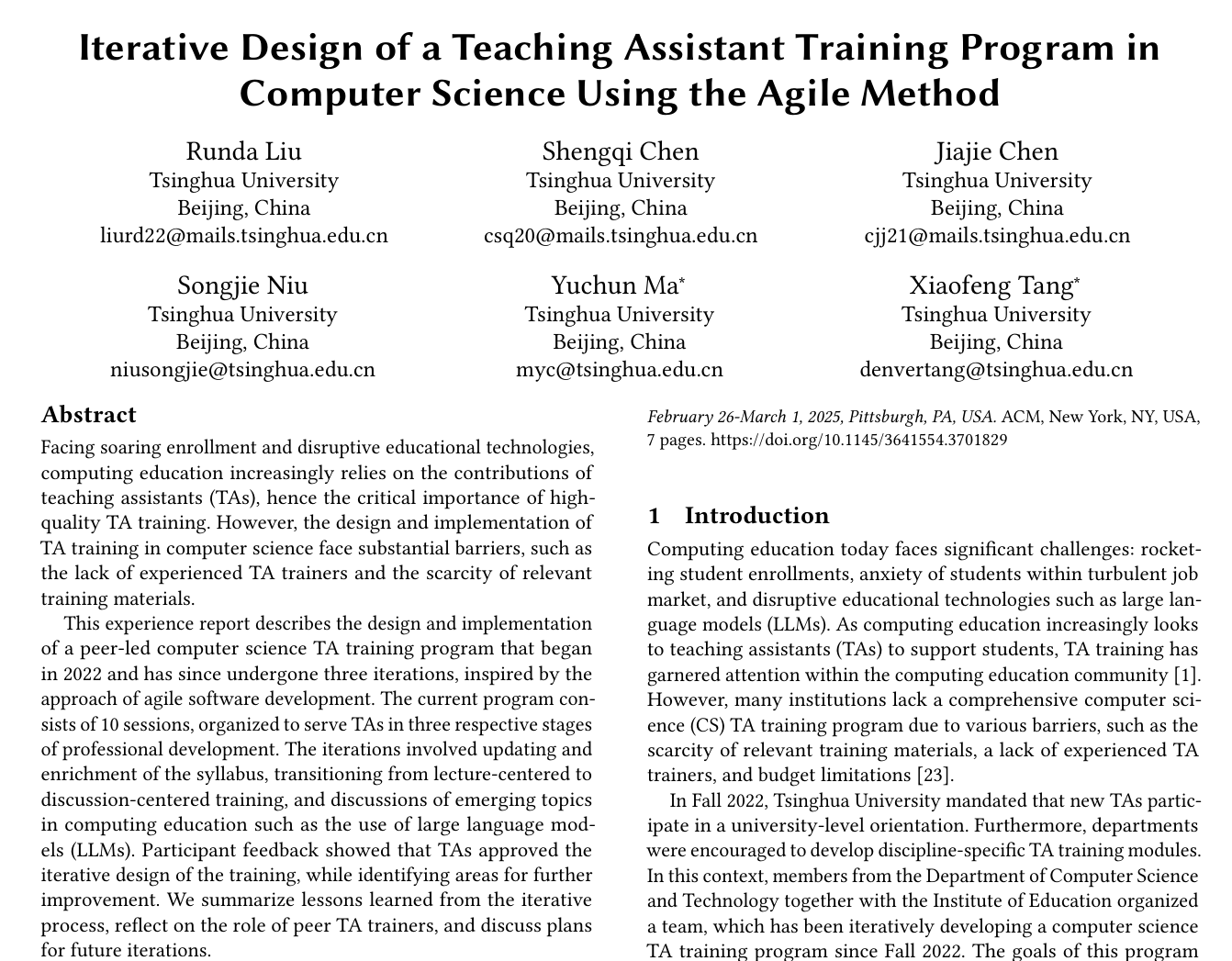清华新闻网3月21日电 近日,第56届ACM计算机教育研讨会(ACM Computer Science Education Technical Symposium, SIGCSE TS)在美国匹兹堡举行。计算机系师生马昱春、陈晟祺(计63)、陈嘉杰(计72)、牛颂杰和教育研究院师生唐潇风、刘润达(教研硕22)合作完成的论文“对计算机专业助教培训项目进行敏捷的迭代设计”(Iterative Design of a Teaching Assistant Training Program in Computer Science Using the Agile Method)被SIGCSE TS 2025接收。论文第一作者为计算机系本科毕业生、教育研究院硕士生刘润达,共同通讯作者为计算机系教授马昱春、教育研究院副教授唐潇风。