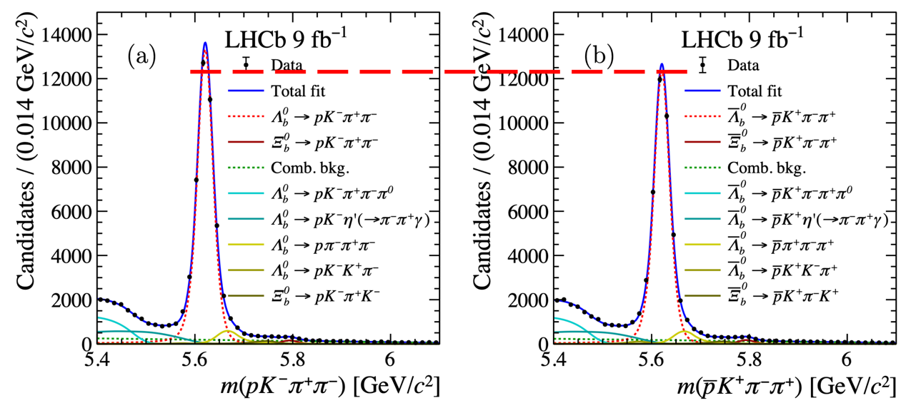 图1.Λ_b0→pK⁻π⁺π⁻衰变(左)与其反过程Λ_b0-bar→p-barK+π⁻π⁺衰变(右)的不变质量分布。各成分产额与曲线高度呈正比。(未扣除产生截面和探测不对称性,共约1.3%)
