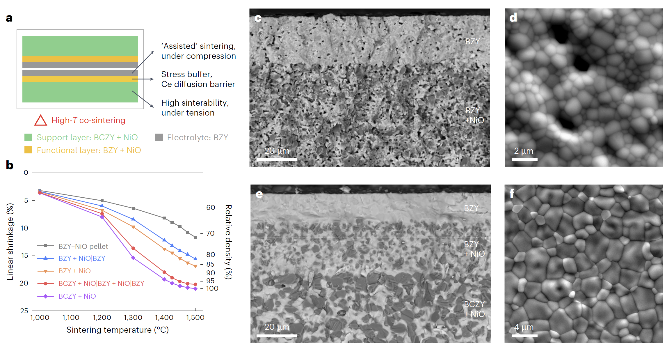 基于上述背景,清华大学材料学院董岩皓助理教授与合作者美国新墨西哥州立大学罗红梅教授、美国麻省理工学院李巨教授和美国爱达荷国家实验室丁冬研究员提出了基于高活性支撑层烧结应力辅助的多层共烧技术,通过支撑层、过渡层和质子膜中氧化镍第二相和铈掺杂浓度的一体化设计,首次在1450摄氏度实现了无烧结助剂、高致密度锆酸钡基质子膜和高性能电化学器件的制备(图1)。研究表明,锆酸钡基质子膜燃料电池和电解池具有优异的电化学性能和稳定性(图2),能够在450至600摄氏度、0.5至0.7个大气压的高水蒸气分压和0.5至2.0安培每平方厘米的高电解电流下展现出高法拉第效率和优异的稳定性,相较于传统的铈酸钡基电解质优势明显。锆酸钡陶瓷烧结技术的突破,有望为高功率密度陶瓷质子膜燃料电池和极端工况电解池的研发与应用提供有力支撑。