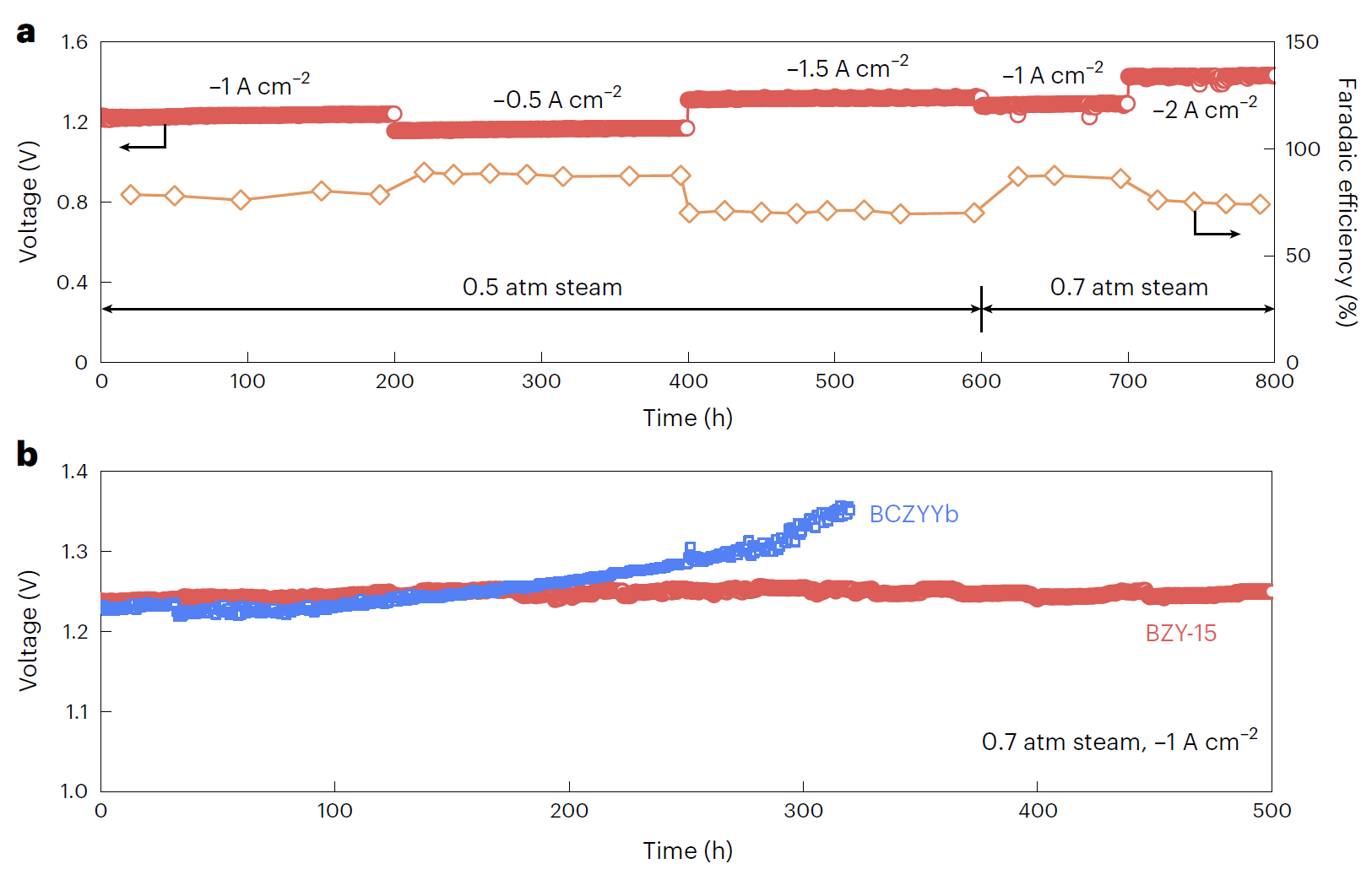 图2.锆酸钡基陶瓷质子膜电池具有优异的电解稳定性