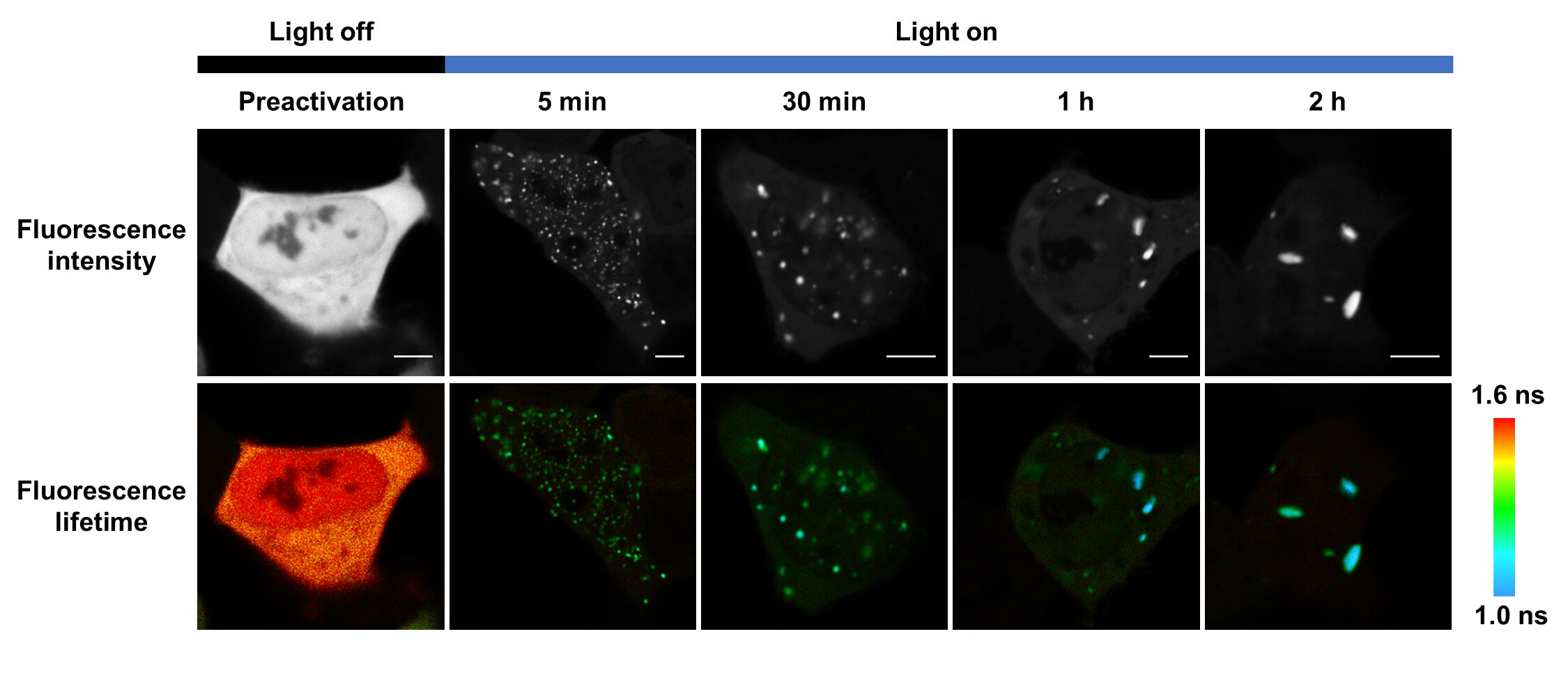 荧光寿命为荧光分子在激发态的停留时间。因其对分子微环境的高度敏感性,且不受荧光强度波动或光漂白效应干扰的特性,为生物分子凝聚体的动态研究提供了新思路。研究人员创新性地提出利用FLIM(荧光寿命显微成像)技术表征蛋白质凝聚体内部流动性的研究策略。