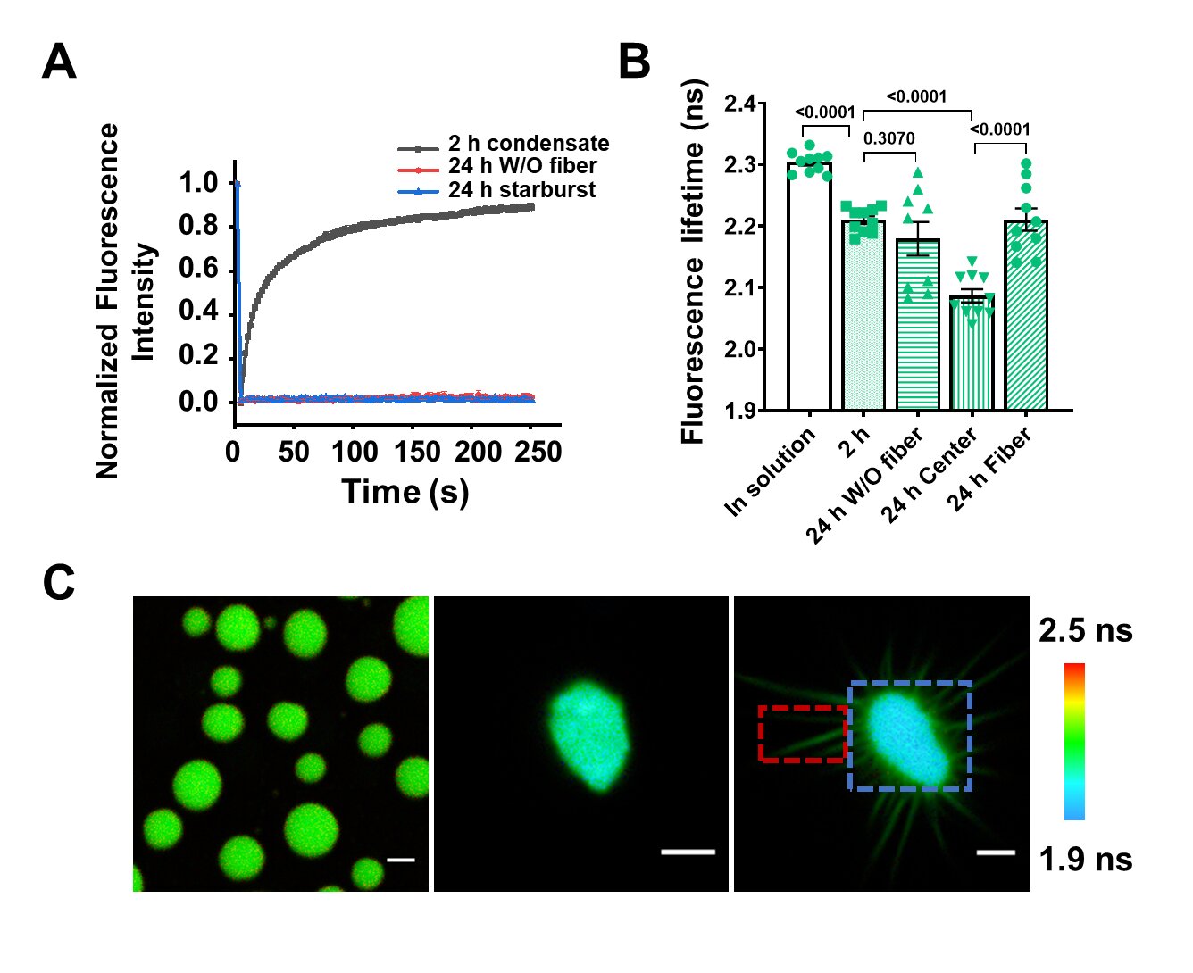 图1.GFP标记的FUS-G156E形成的凝聚体流动性(A)和GFP荧光寿命(B和C)随液-固相变降低