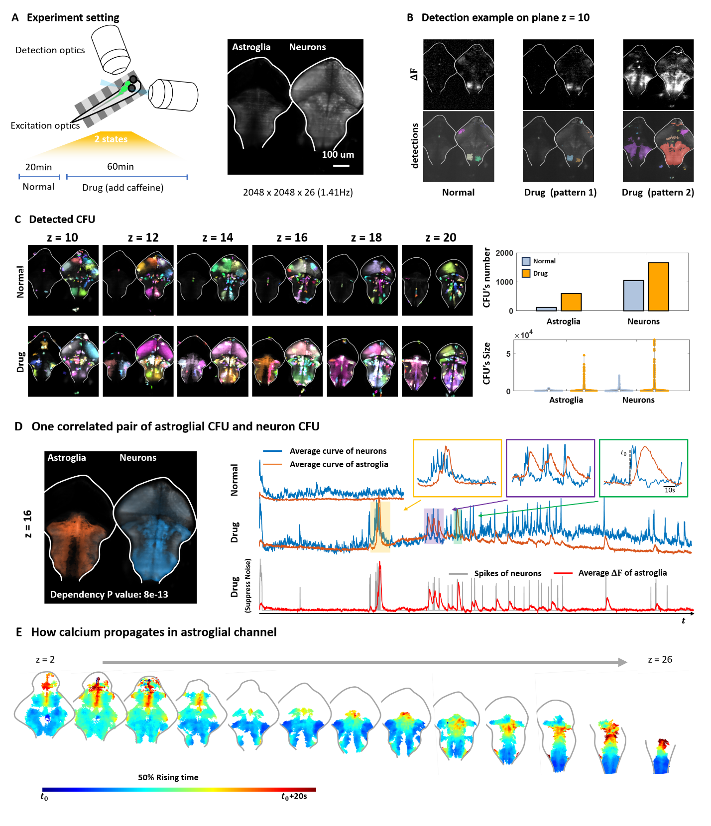 图2.AQuA2识别咖啡因对斑马鱼星形胶质细胞和神经元信号模式的影响